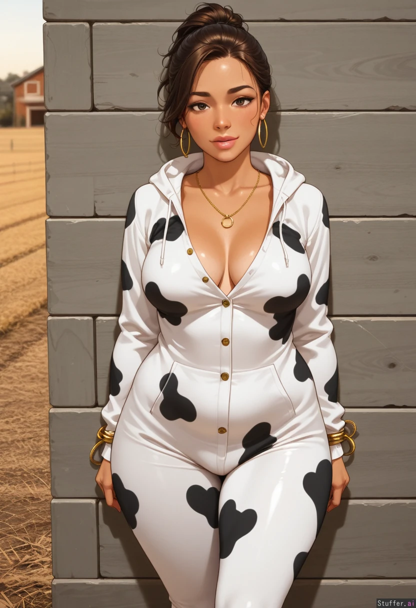 1girl, ((Perfect face)), ((tanned skin)), sharp jawline, 21 years old, long wavy brown hair, hair tied up, dark green brown eyes, brown eyebrows, nose piercing, golden hoop earrings, fat lips, pink lips, blush makeup, golden necklace, realistic face, beautiful legs, Medium breasts, wide hips, Standing against wall, farm, daytime, golden hour, Cow onesie with buttons, tight clothes, unbuttoned, horny expression, flirting with viewer, has a crush on the viewer, (stuffed belly, potbelly, love handles, chubby, obese, spilling belly, belly rolls, bulging belly: 0.0 )