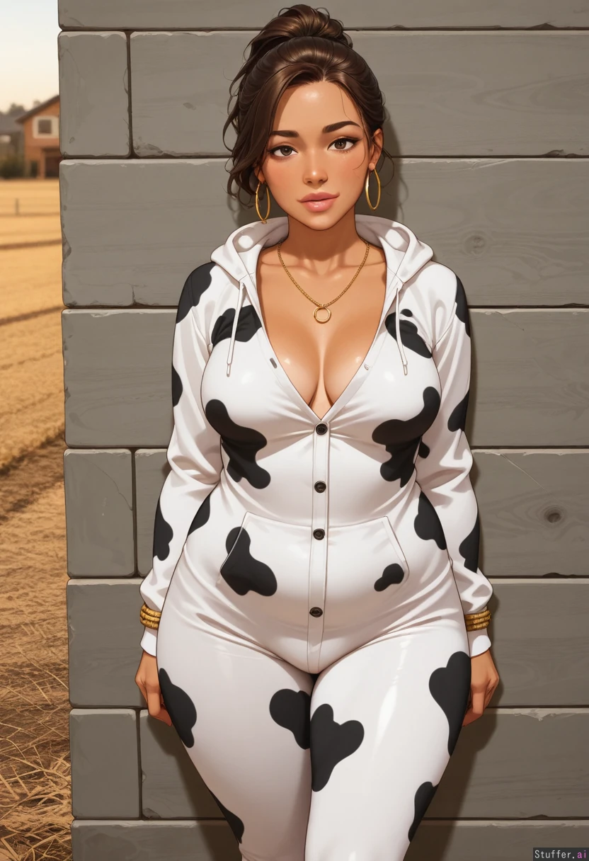 1girl, ((Perfect face)), ((tanned skin)), sharp jawline, 21 years old, long wavy brown hair, hair tied up, dark green brown eyes, brown eyebrows, nose piercing, golden hoop earrings, fat lips, pink lips, blush makeup, golden necklace, realistic face, beautiful legs, Medium breasts, wide hips, Standing against wall, farm, daytime, golden hour, Cow onesie with buttons, tight clothes, unbuttoned, horny expression, flirting with viewer, has a crush on the viewer, (stuffed belly, potbelly, love handles, chubby, obese, spilling belly, belly rolls, bulging belly: 0.6 )