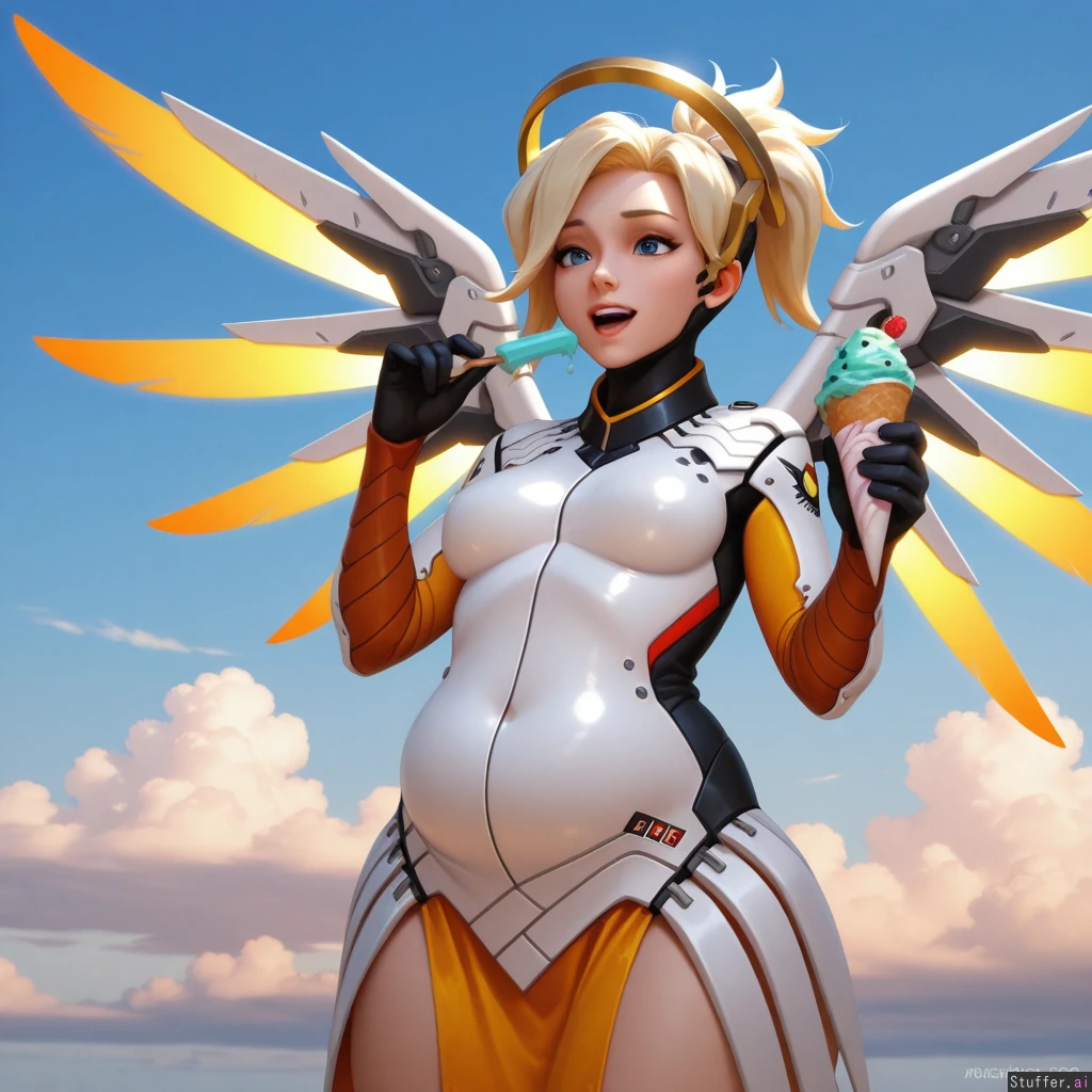 best_quality, hdr, overwatch, mercy, clouds, flying, daytime, excited, eating, ice_cream, cone, (skinny:1.0), (tall:1.0), (overweight:1.02), (wide_hips:0.8), (bottom_heavy:0.8), (belly:1.02), (contrast), (solo:1girl)