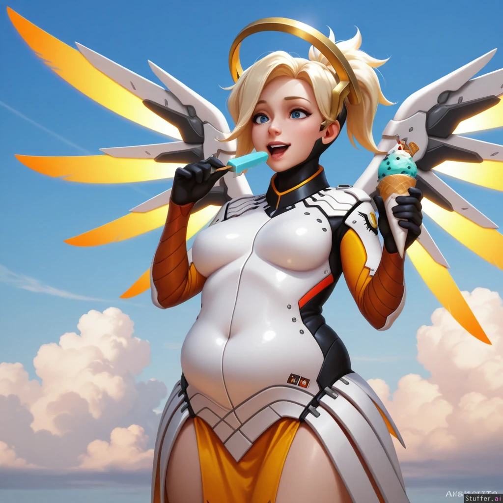 best_quality, hdr, overwatch, mercy, clouds, flying, daytime, excited, eating, ice_cream, cone, (skinny:1.0), (tall:1.0), (overweight:1.06), (wide_hips:0.8), (bottom_heavy:0.8), (belly:1.06), (contrast), (solo:1girl)