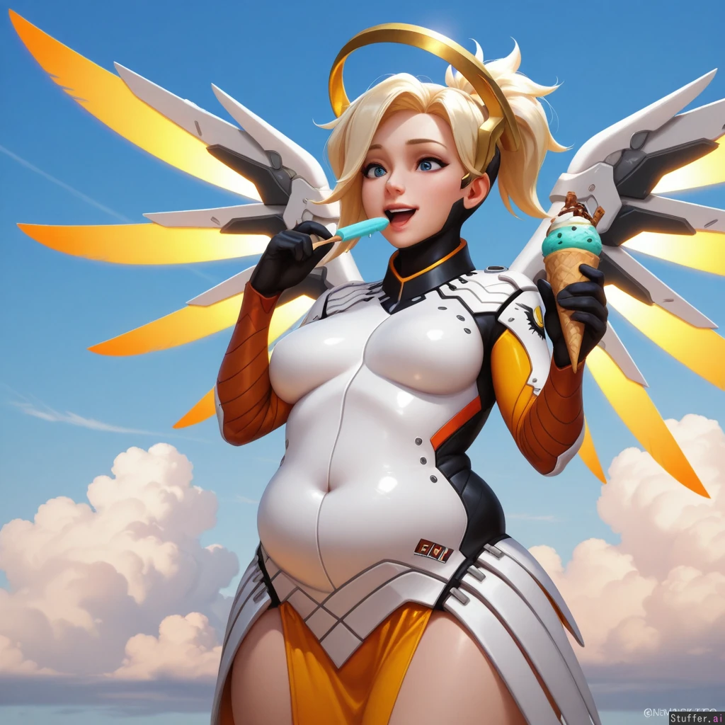 best_quality, hdr, overwatch, mercy, clouds, flying, daytime, excited, eating, ice_cream, cone, (skinny:1.0), (tall:1.0), (overweight:1.08), (wide_hips:0.8), (bottom_heavy:0.8), (belly:1.08), (contrast), (solo:1girl)