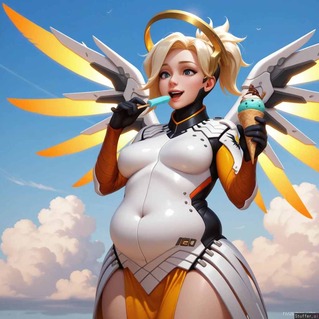 best_quality, hdr, overwatch, mercy, clouds, flying, daytime, excited, eating, ice_cream, cone, (skinny:1.0), (tall:1.0), (overweight:1.09), (wide_hips:0.8), (bottom_heavy:0.8), (belly:1.09), (contrast), (solo:1girl)