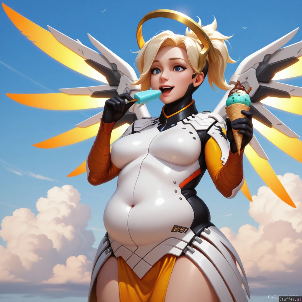 best_quality, hdr, overwatch, mercy, clouds, flying, daytime, excited, eating, ice_cream, cone, (skinny:1.0), (tall:1.0), (overweight:1.1), (wide_hips:0.8), (bottom_heavy:0.8), (belly:1.1), (contrast), (solo:1girl)