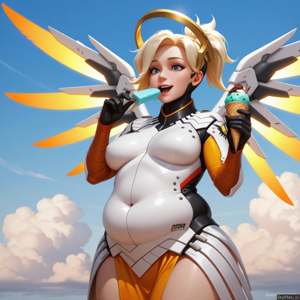 best_quality, hdr, overwatch, mercy, clouds, flying, daytime, excited, eating, ice_cream, cone, (skinny:1.0), (tall:1.0), (overweight:1.13), (wide_hips:0.8), (bottom_heavy:0.8), (belly:1.13), (contrast), (solo:1girl)