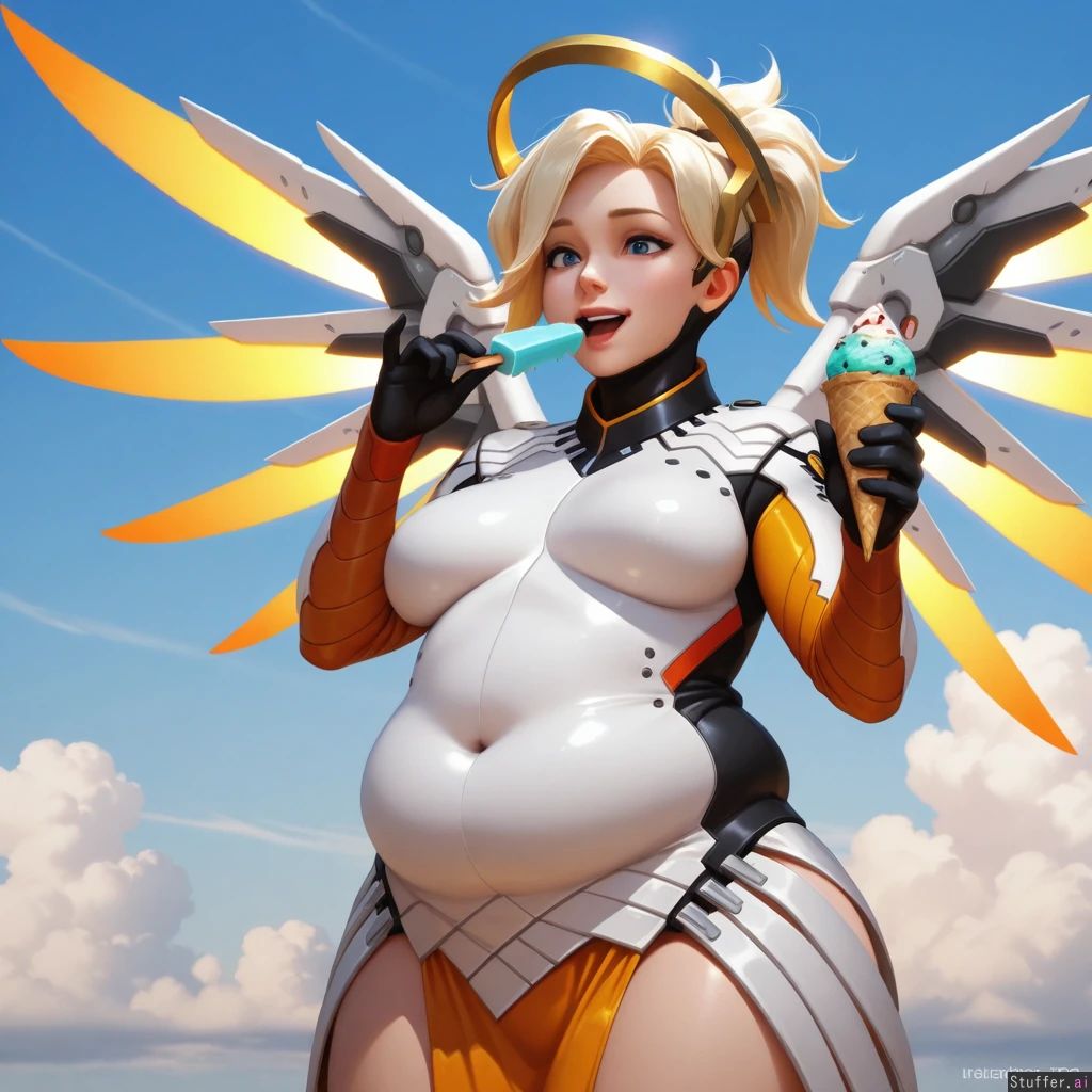 best_quality, hdr, overwatch, mercy, clouds, flying, daytime, excited, eating, ice_cream, cone, (skinny:1.0), (tall:1.0), (overweight:1.17), (wide_hips:0.8), (bottom_heavy:0.8), (belly:1.17), (contrast), (solo:1girl)