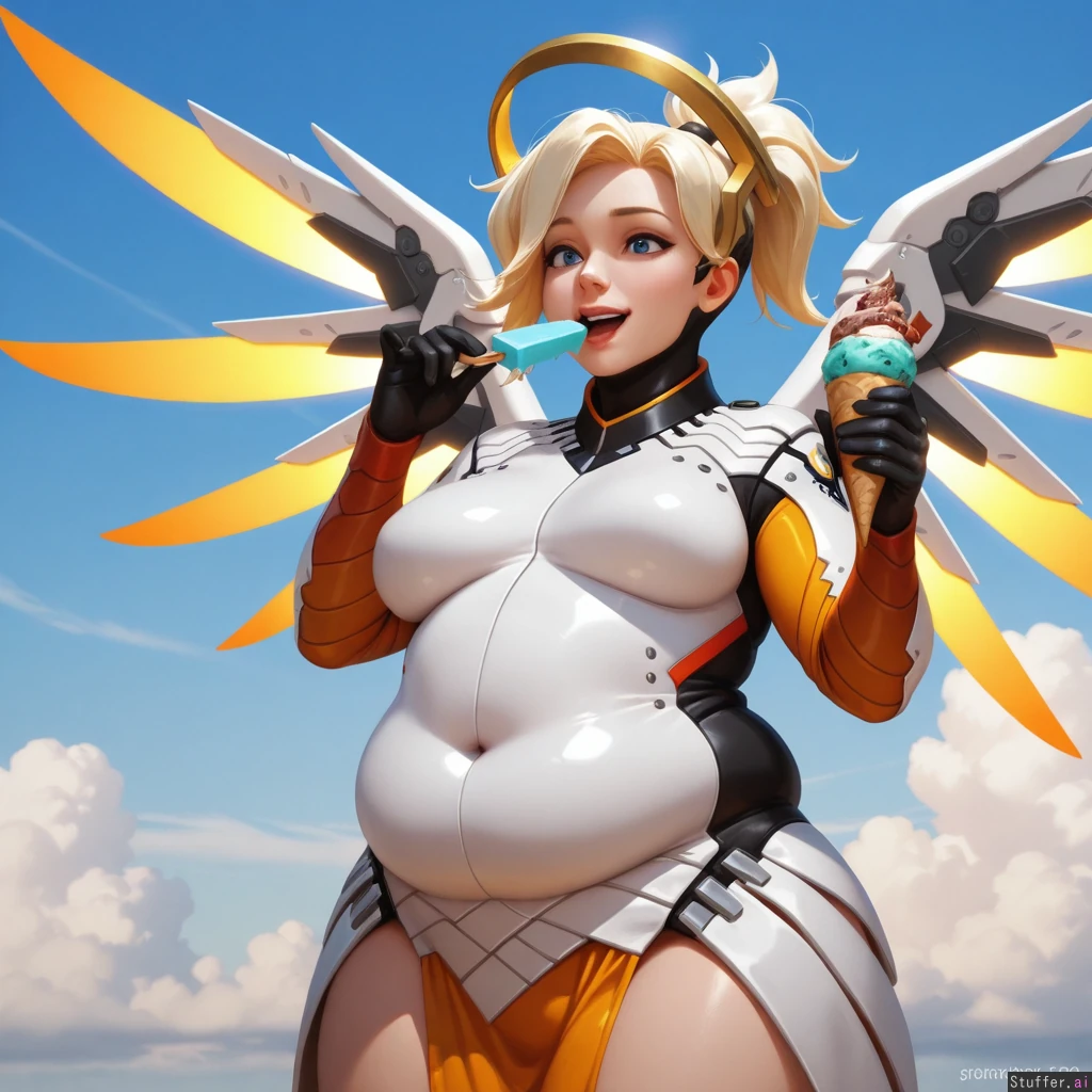 best_quality, hdr, overwatch, mercy, clouds, flying, daytime, excited, eating, ice_cream, cone, (skinny:1.0), (tall:1.0), (overweight:1.19), (wide_hips:0.8), (bottom_heavy:0.8), (belly:1.19), (contrast), (solo:1girl)