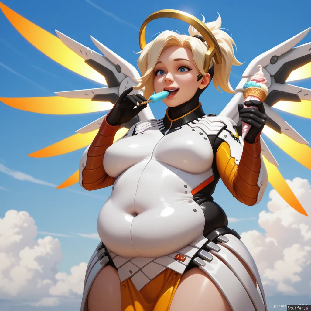 best_quality, hdr, overwatch, mercy, clouds, flying, daytime, excited, eating, ice_cream, cone, (skinny:1.0), (tall:1.0), (overweight:1.22), (wide_hips:0.8), (bottom_heavy:0.8), (belly:1.22), (contrast), (solo:1girl)