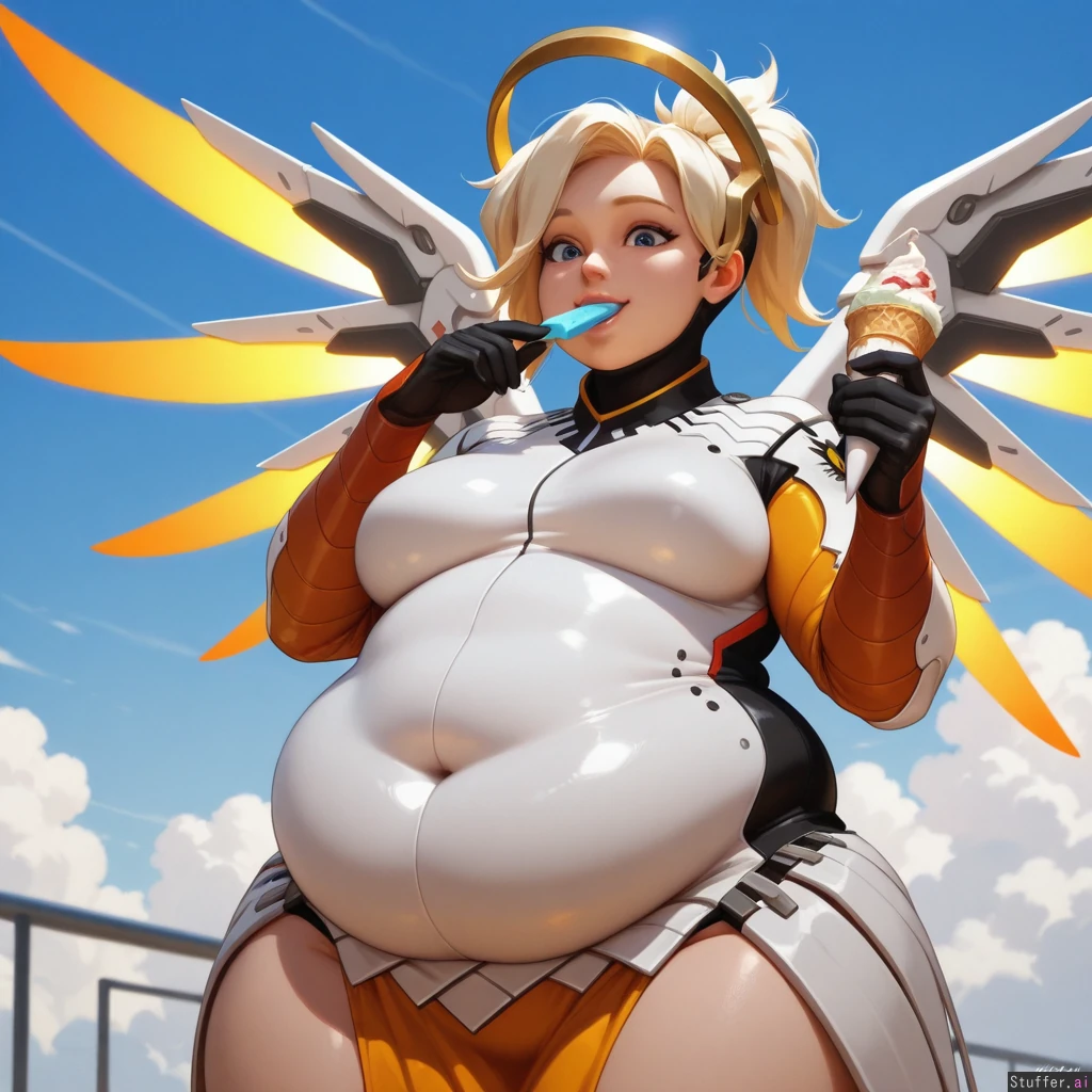 best_quality, hdr, overwatch, mercy, clouds, flying, daytime, excited, eating, ice_cream, cone, (skinny:1.0), (tall:1.0), (overweight:1.28), (wide_hips:0.8), (bottom_heavy:0.8), (belly:1.28), (contrast), (solo:1girl)