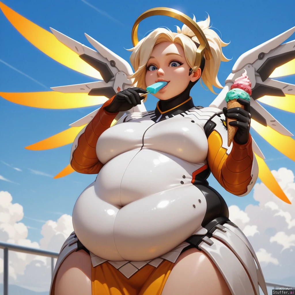 best_quality, hdr, overwatch, mercy, clouds, flying, daytime, excited, eating, ice_cream, cone, (skinny:1.0), (tall:1.0), (overweight:1.29), (wide_hips:0.8), (bottom_heavy:0.8), (belly:1.29), (contrast), (solo:1girl)
