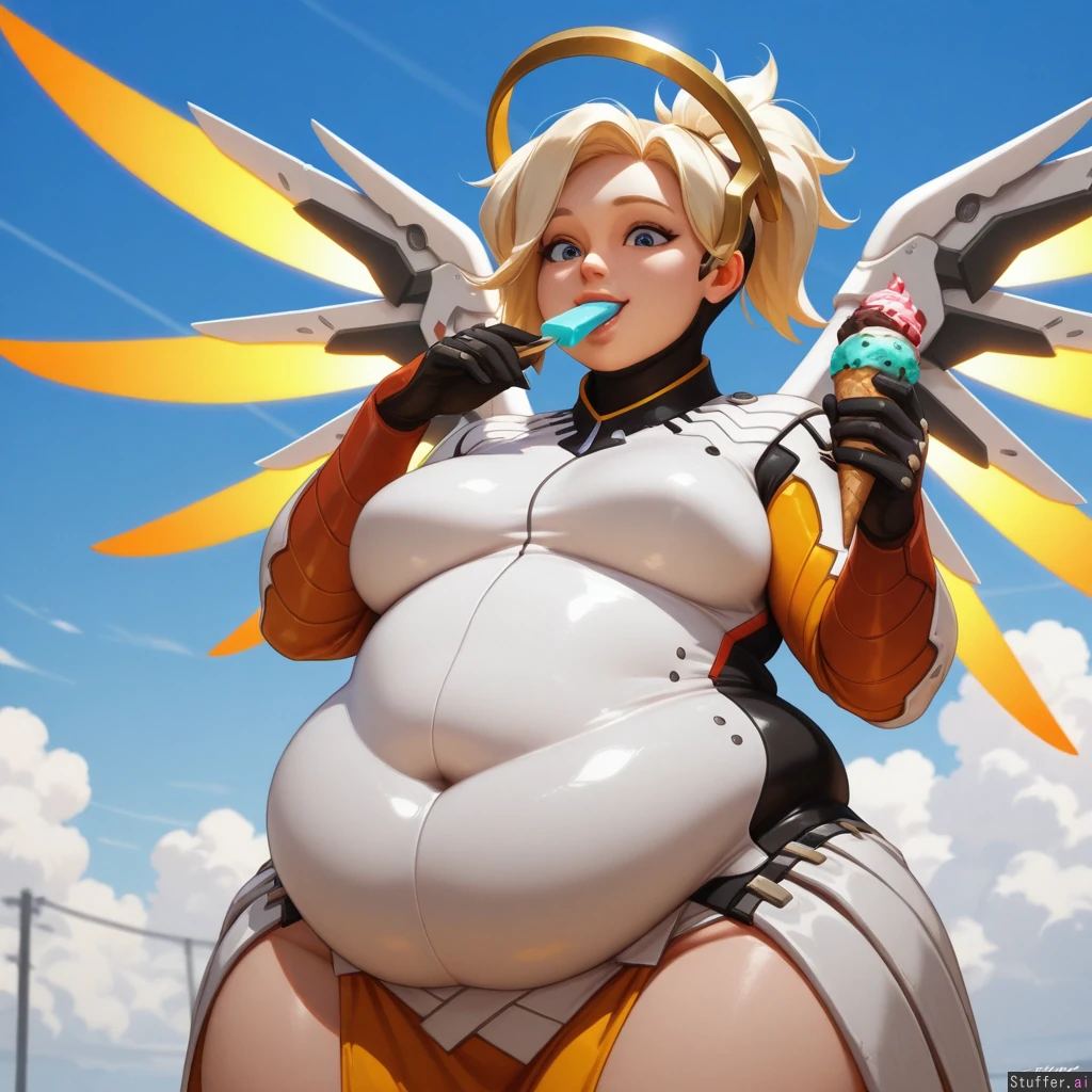 best_quality, hdr, overwatch, mercy, clouds, flying, daytime, excited, eating, ice_cream, cone, (skinny:1.0), (tall:1.0), (overweight:1.3), (wide_hips:0.8), (bottom_heavy:0.8), (belly:1.3), (contrast), (solo:1girl)