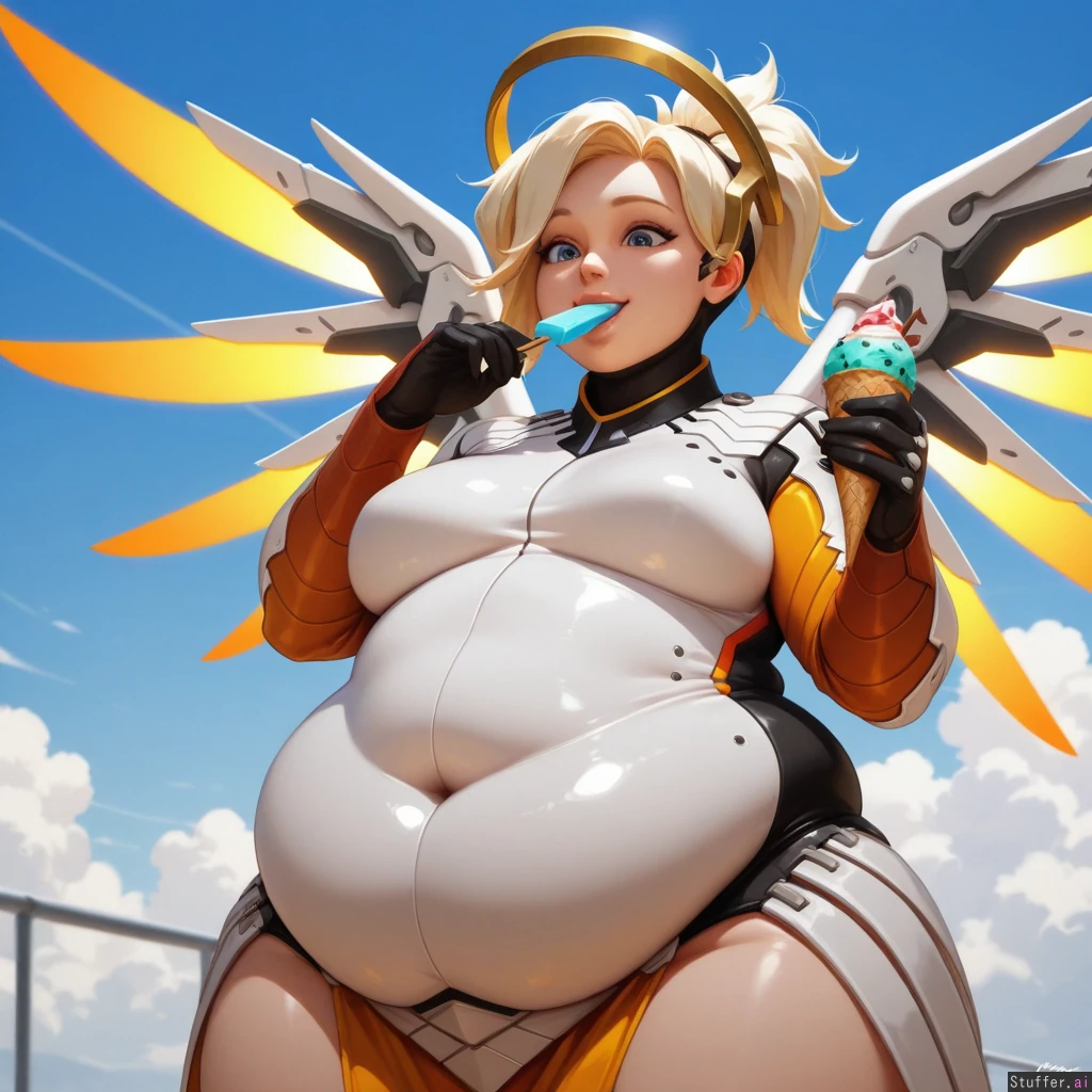 best_quality, hdr, overwatch, mercy, clouds, flying, daytime, excited, eating, ice_cream, cone, (skinny:1.0), (tall:1.0), (overweight:1.31), (wide_hips:0.8), (bottom_heavy:0.8), (belly:1.31), (contrast), (solo:1girl)