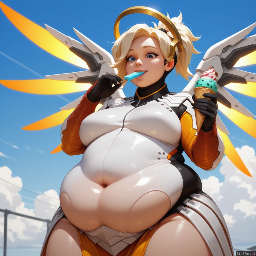 best_quality, hdr, overwatch, mercy, clouds, flying, daytime, excited, eating, ice_cream, cone, (skinny:1.0), (tall:1.0), (overweight:1.32), (wide_hips:0.8), (bottom_heavy:0.8), (belly:1.32), (contrast), (solo:1girl)