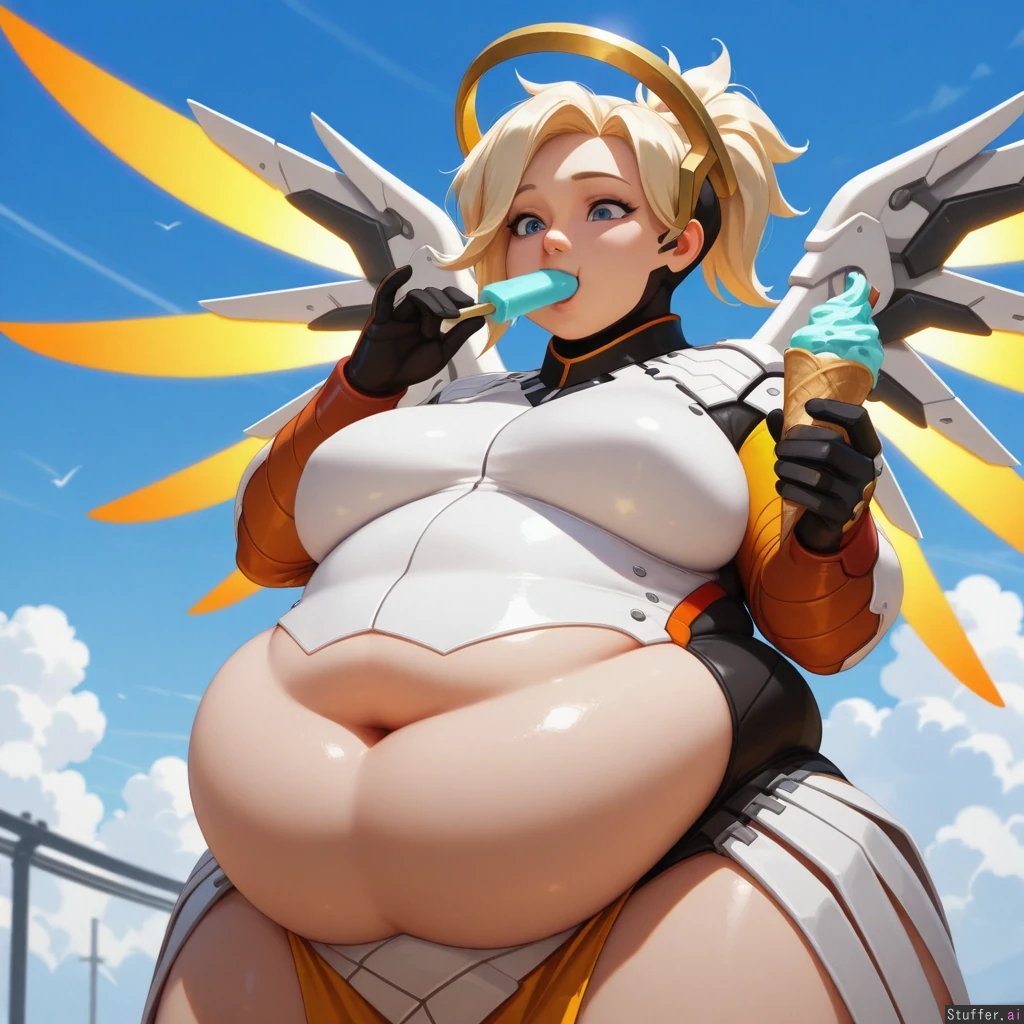 best_quality, hdr, overwatch, mercy, clouds, flying, daytime, excited, eating, ice_cream, cone, (skinny:1.0), (tall:1.0), (overweight:1.39), (wide_hips:0.8), (bottom_heavy:0.8), (belly:1.39), (contrast), (solo:1girl)