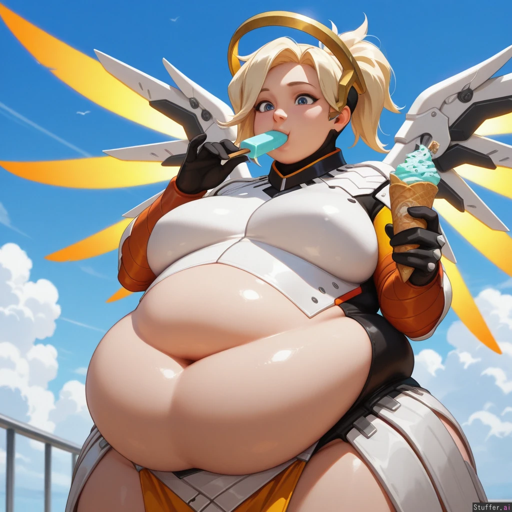 best_quality, hdr, overwatch, mercy, clouds, flying, daytime, excited, eating, ice_cream, cone, (skinny:1.0), (tall:1.0), (overweight:1.45), (wide_hips:0.8), (bottom_heavy:0.8), (belly:1.45), (contrast), (solo:1girl)