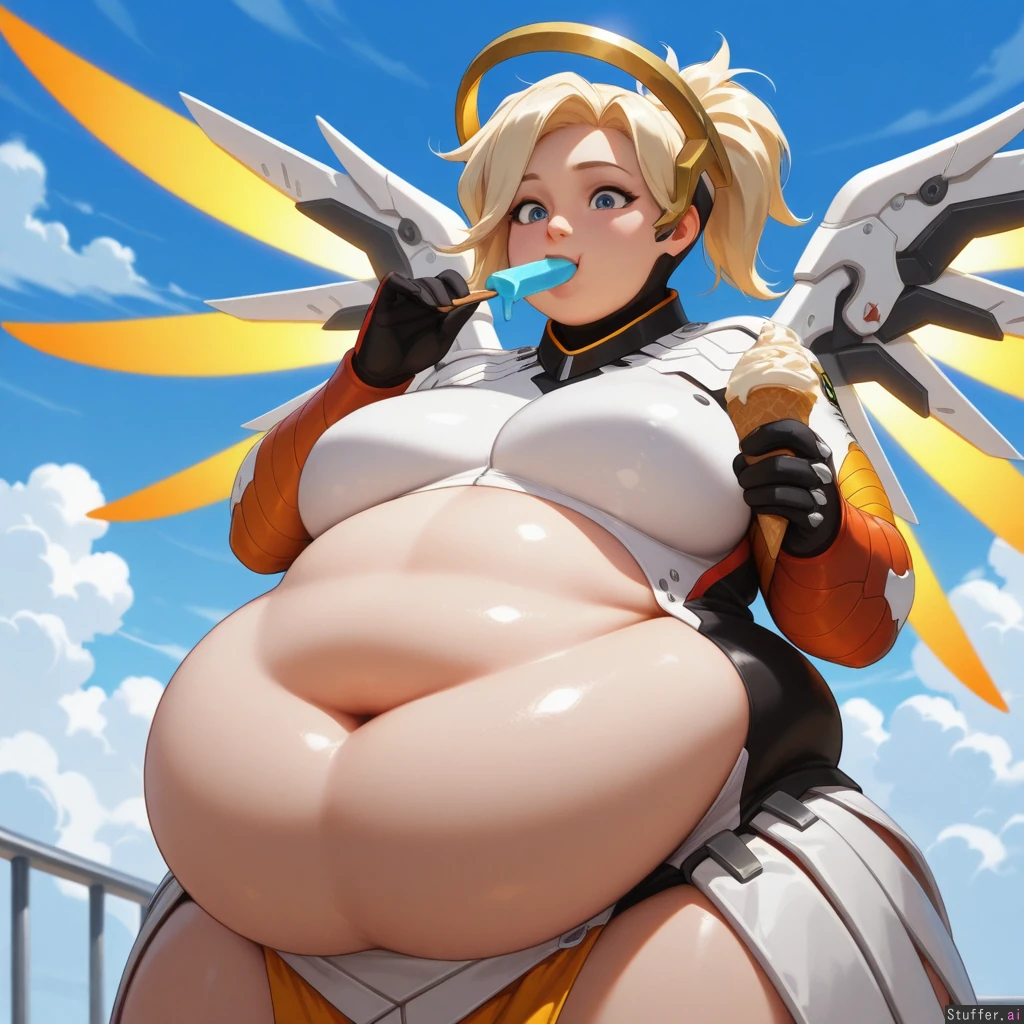 best_quality, hdr, overwatch, mercy, clouds, flying, daytime, excited, eating, ice_cream, cone, (skinny:1.0), (tall:1.0), (overweight:1.48), (wide_hips:0.8), (bottom_heavy:0.8), (belly:1.48), (contrast), (solo:1girl)