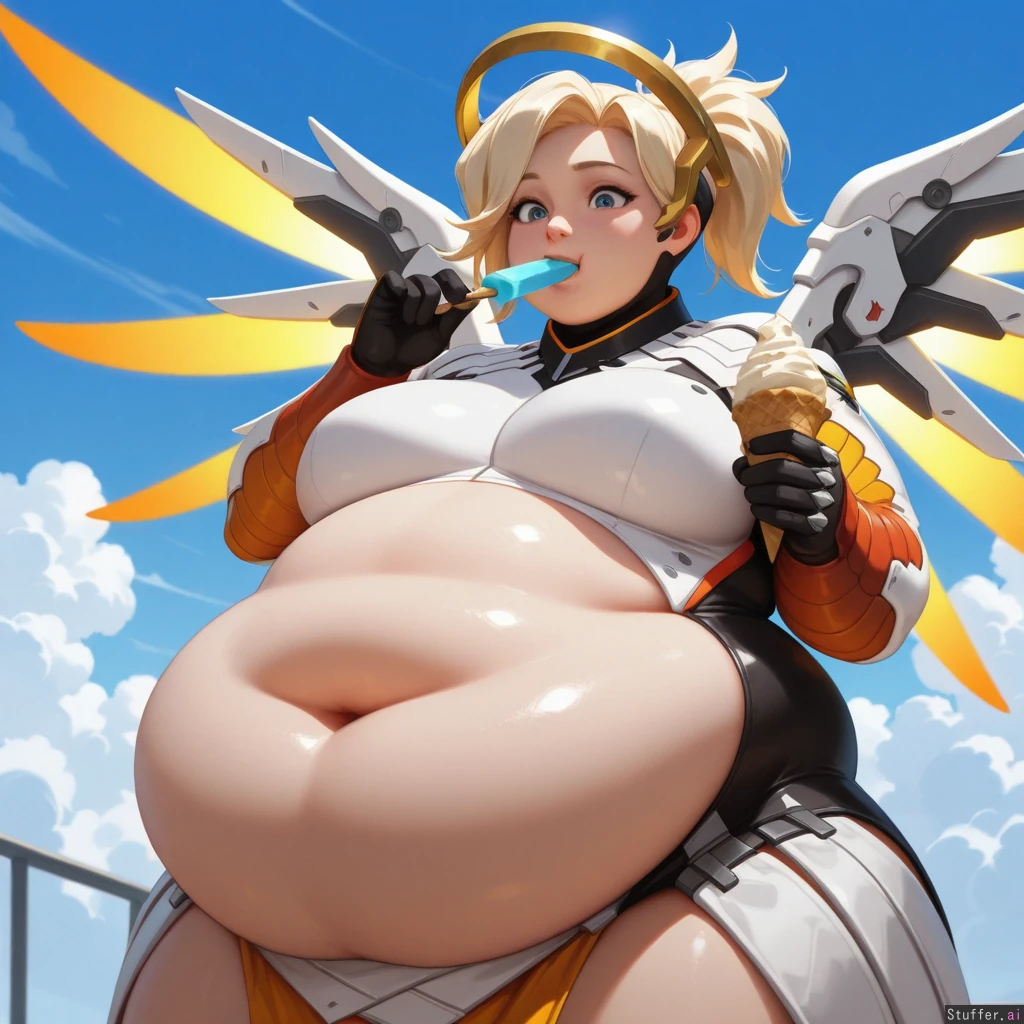 best_quality, hdr, overwatch, mercy, clouds, flying, daytime, excited, eating, ice_cream, cone, (skinny:1.0), (tall:1.0), (overweight:1.5), (wide_hips:0.8), (bottom_heavy:0.8), (belly:1.5), (contrast), (solo:1girl)