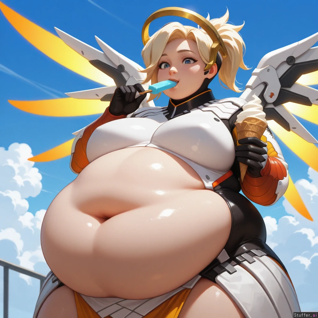 best_quality, hdr, overwatch, mercy, clouds, flying, daytime, excited, eating, ice_cream, cone, (skinny:1.0), (tall:1.0), (overweight:1.51), (wide_hips:0.8), (bottom_heavy:0.8), (belly:1.51), (contrast), (solo:1girl)