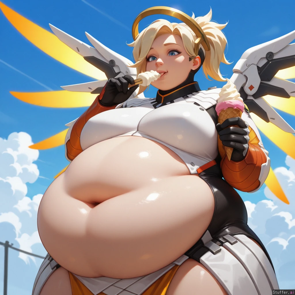 best_quality, hdr, overwatch, mercy, clouds, flying, daytime, excited, eating, ice_cream, cone, (skinny:1.0), (tall:1.0), (overweight:1.54), (wide_hips:0.8), (bottom_heavy:0.8), (belly:1.54), (contrast), (solo:1girl)