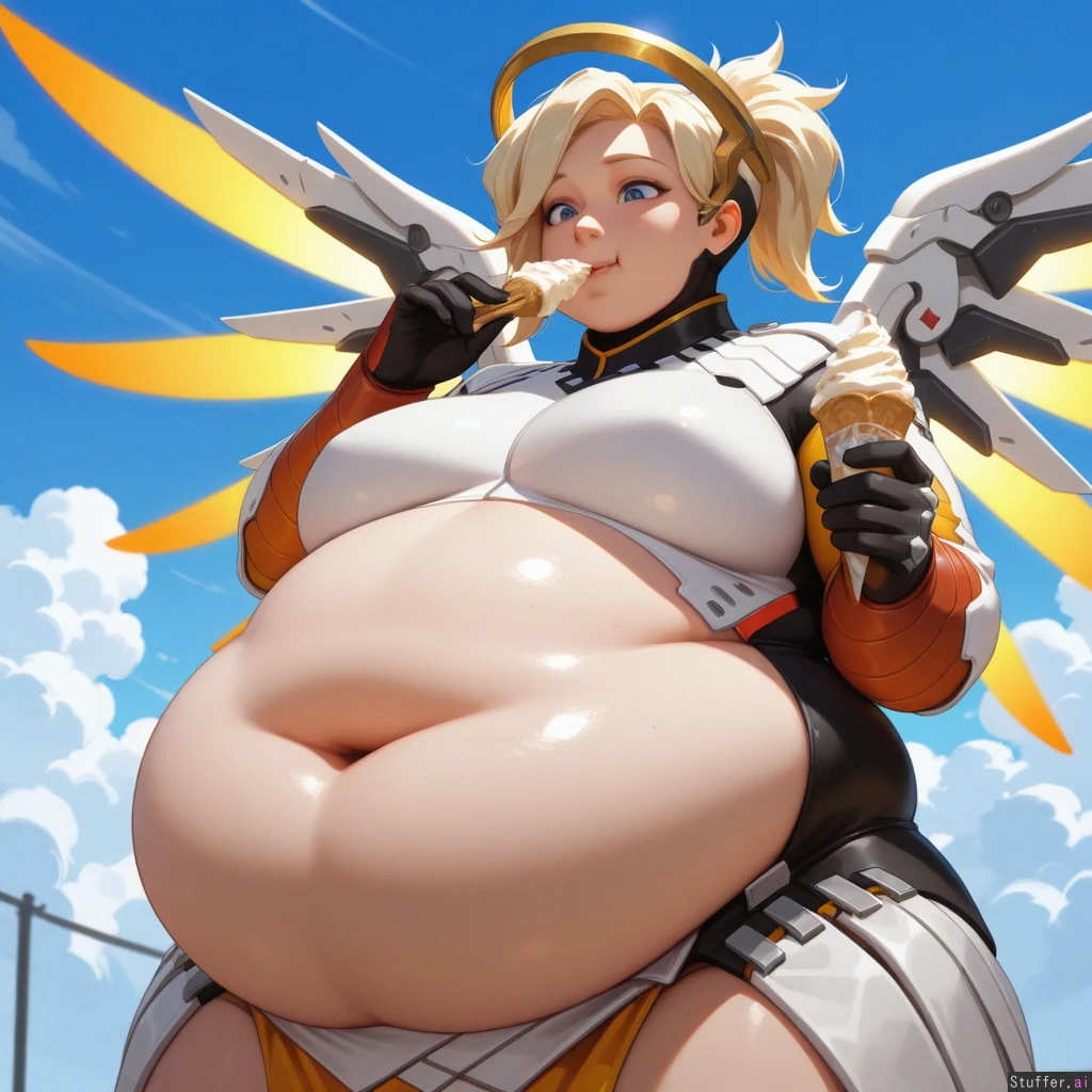 best_quality, hdr, overwatch, mercy, clouds, flying, daytime, excited, eating, ice_cream, cone, (skinny:1.0), (tall:1.0), (overweight:1.58), (wide_hips:0.8), (bottom_heavy:0.8), (belly:1.58), (contrast), (solo:1girl)