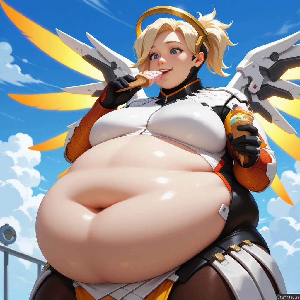 best_quality, hdr, overwatch, mercy, clouds, flying, daytime, excited, eating, ice_cream, cone, (skinny:1.0), (tall:1.0), (overweight:1.69), (wide_hips:0.8), (bottom_heavy:0.8), (belly:1.69), (contrast), (solo:1girl)