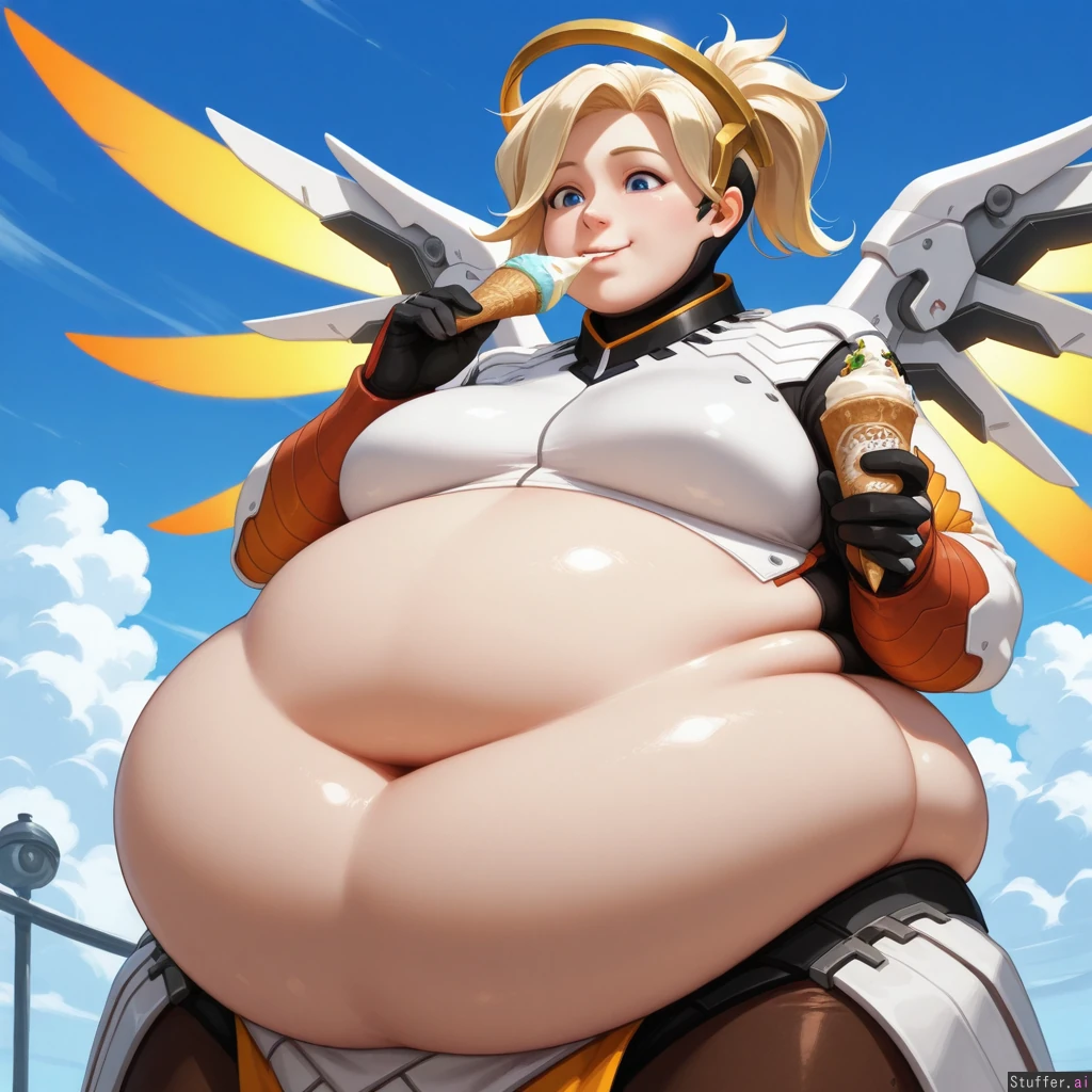 best_quality, hdr, overwatch, mercy, clouds, flying, daytime, excited, eating, ice_cream, cone, (skinny:1.0), (tall:1.0), (overweight:1.8), (wide_hips:0.8), (bottom_heavy:0.8), (belly:1.8), (contrast), (solo:1girl)