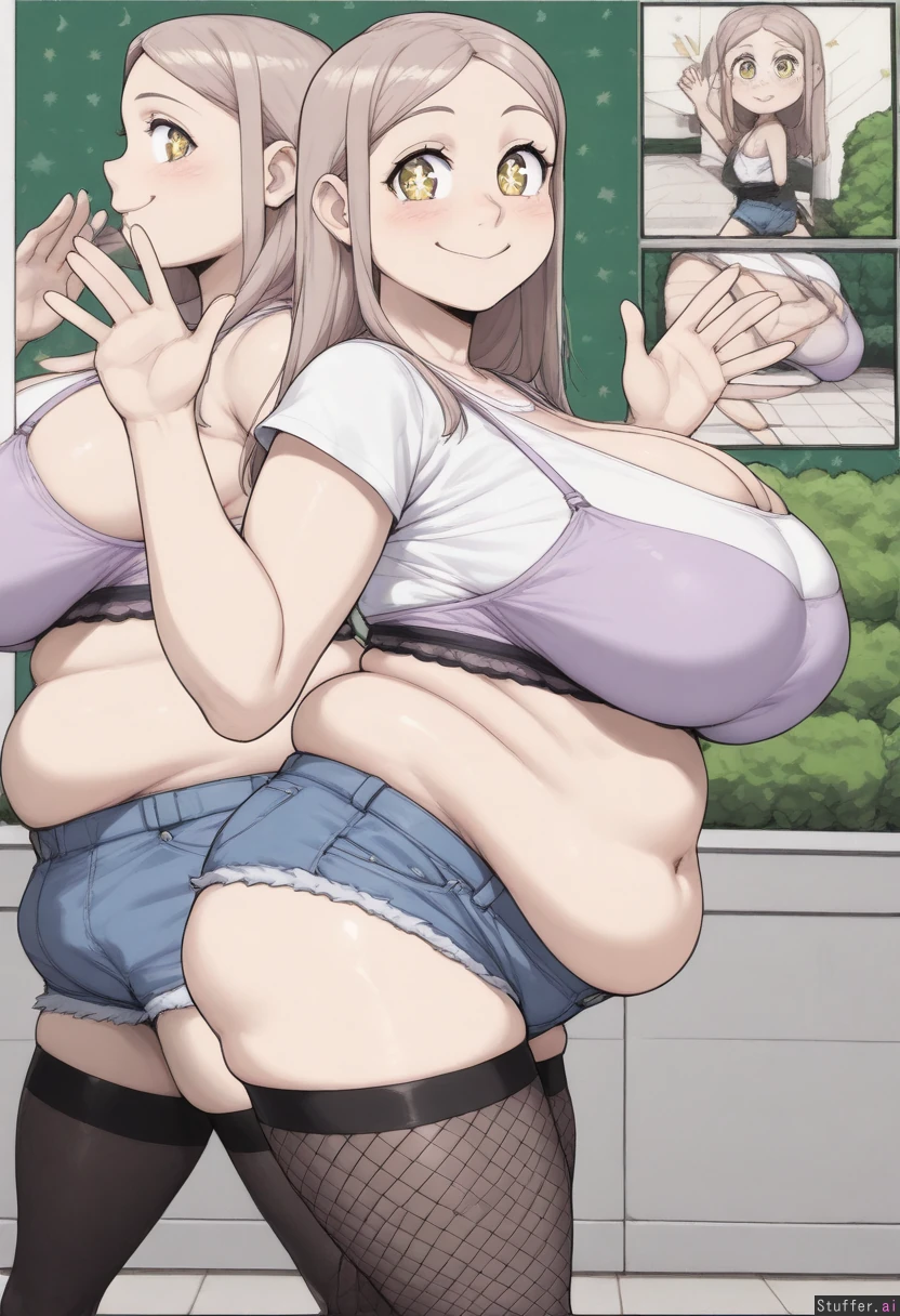 Solo, Krekkov (artist), KAMII MOMORU(artist), ((vibrant colors)), perfect proportions, (straight hair hair, light brown hair, no bangs), dark eyes, cute face, large cute eyes, tan skin, cute pose, (((tight light purple bra, lacey crop top, blue jean shorts, black fishnet thigh highs))), (manga style drawing, (side view), walking in a driveway, green garden in the background, big breasts, ((Skinny)), large muffin top (blushing, cute smile, wide eyes, stars in her eyes, waving, saying hi), fat, (thick thighs, fat thighs, bulging thighs, wide hips:1.0), (bigger breasts:1.5)