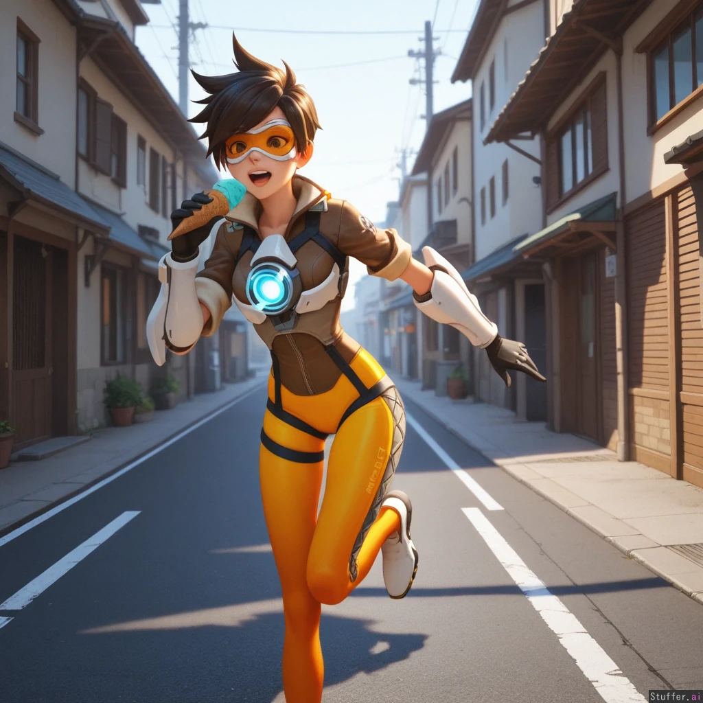 best_quality, hdr, overwatch, tracer, street, running, daytime, excited, eating, ice_cream, cone, (skinny:1.0), (tall:1.0), (overweight:0.82), (wide_hips:0.8), (bottom_heavy:0.8), (belly:0.82), (contrast), (solo:1girl)