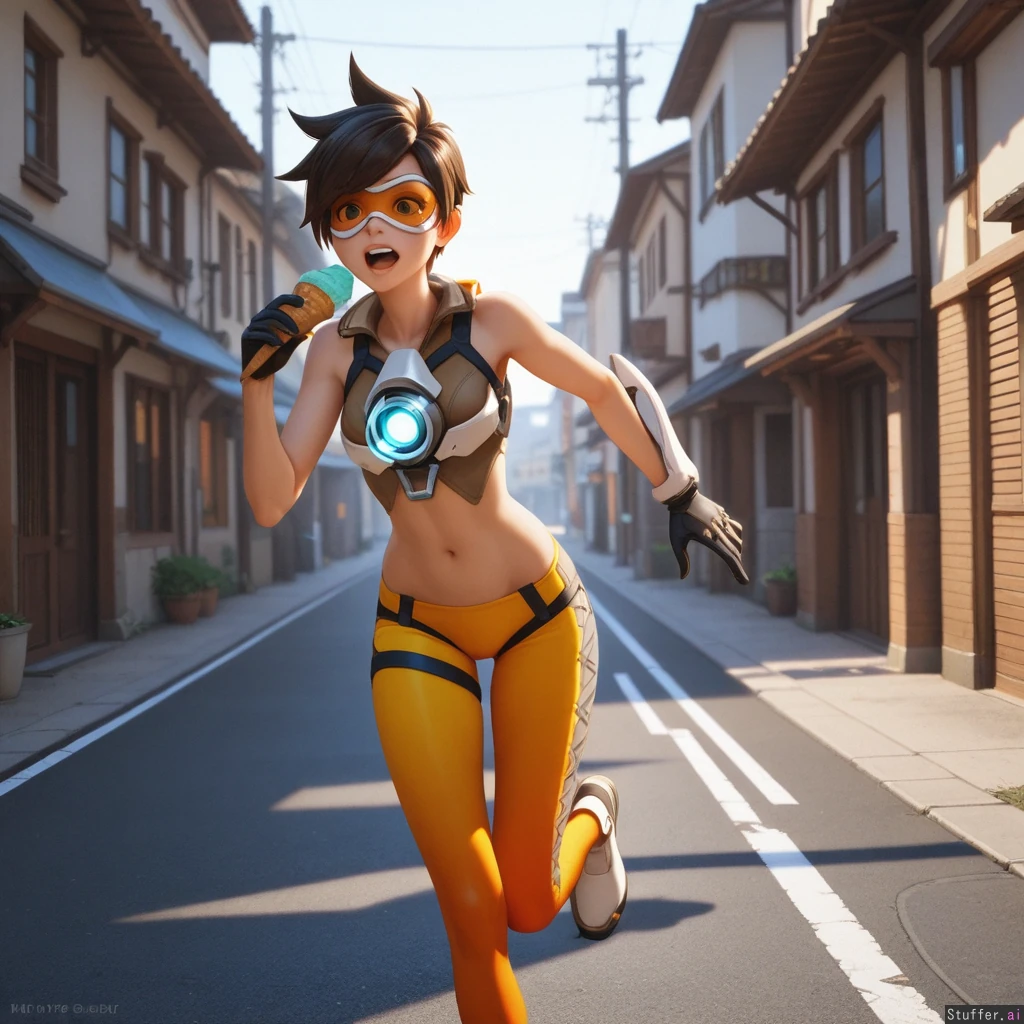 best_quality, hdr, overwatch, tracer, street, running, daytime, excited, eating, ice_cream, cone, (skinny:1.0), (tall:1.0), (overweight:0.89), (wide_hips:0.8), (bottom_heavy:0.8), (belly:0.89), (contrast), (solo:1girl)