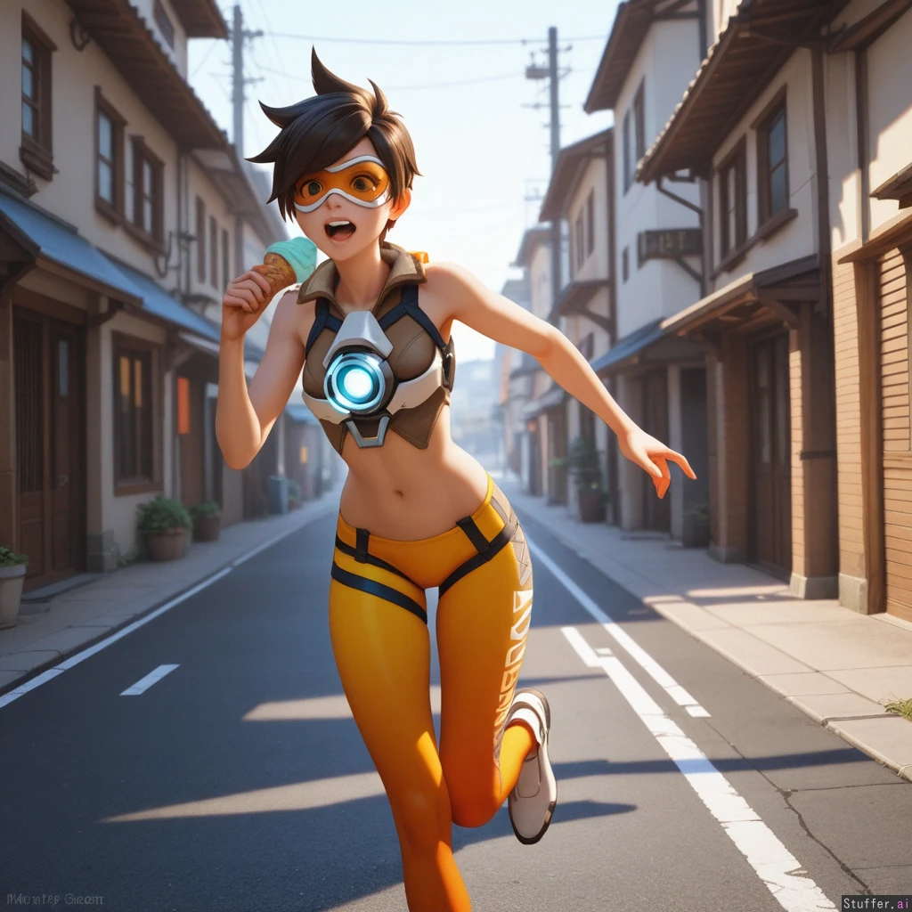 best_quality, hdr, overwatch, tracer, street, running, daytime, excited, eating, ice_cream, cone, (skinny:1.0), (tall:1.0), (overweight:0.9), (wide_hips:0.8), (bottom_heavy:0.8), (belly:0.9), (contrast), (solo:1girl)