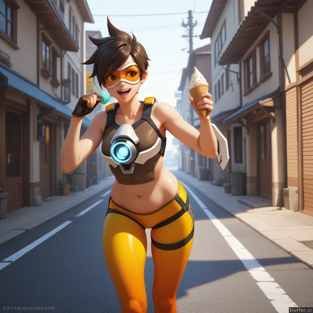best_quality, hdr, overwatch, tracer, street, running, daytime, excited, eating, ice_cream, cone, (skinny:1.0), (tall:1.0), (overweight:1), (wide_hips:0.8), (bottom_heavy:0.8), (belly:1), (contrast), (solo:1girl)