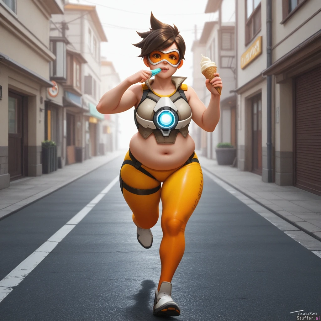 best_quality, hdr, overwatch, tracer, street, running, daytime, excited, eating, ice_cream, cone, (skinny:1.0), (tall:1.0), (overweight:1.01), (wide_hips:0.8), (bottom_heavy:0.8), (belly:1.01), (contrast), (solo:1girl)