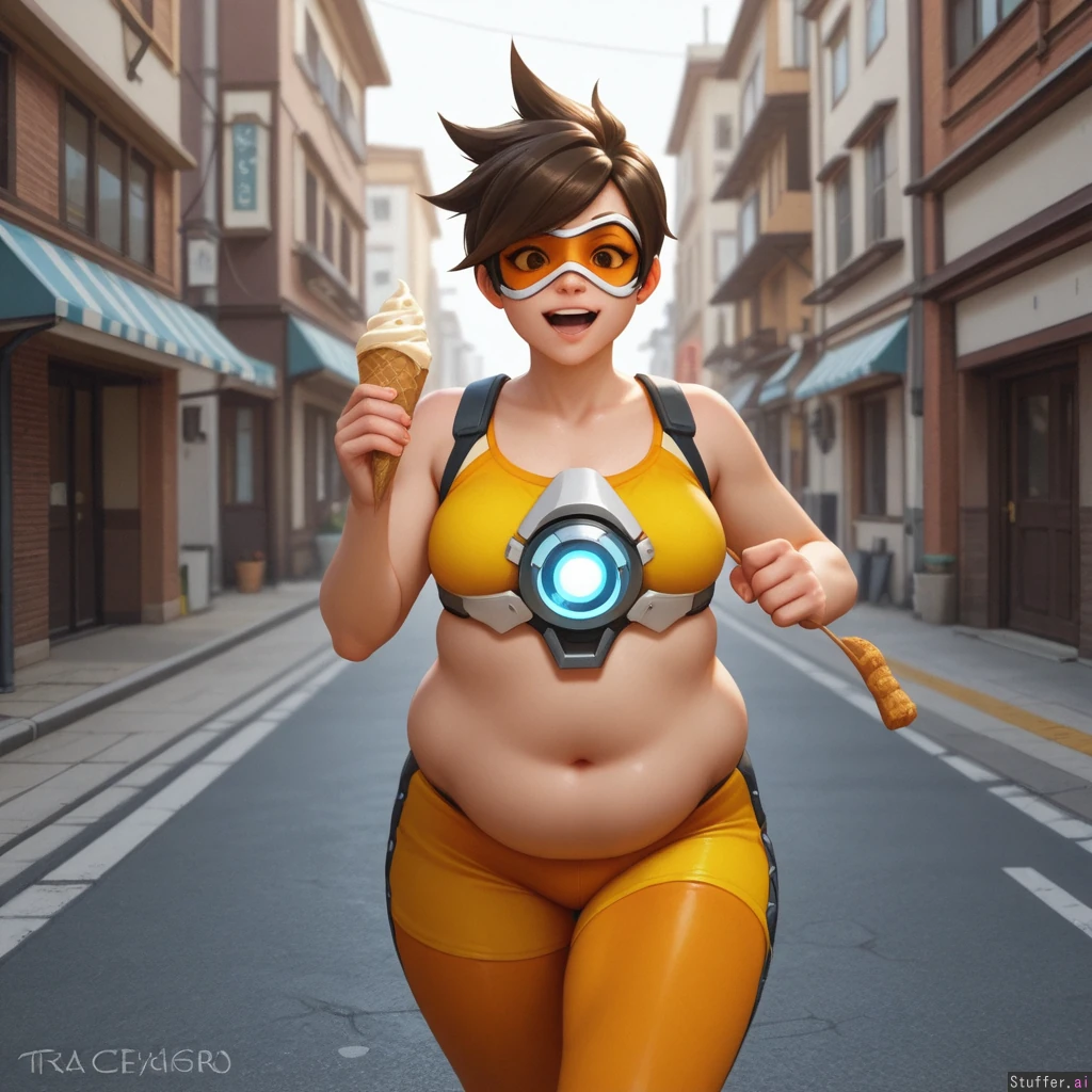 best_quality, hdr, overwatch, tracer, street, running, daytime, excited, eating, ice_cream, cone, (skinny:1.0), (tall:1.0), (overweight:1.01), (wide_hips:0.8), (bottom_heavy:0.8), (belly:1.01), (contrast), (solo:1girl)