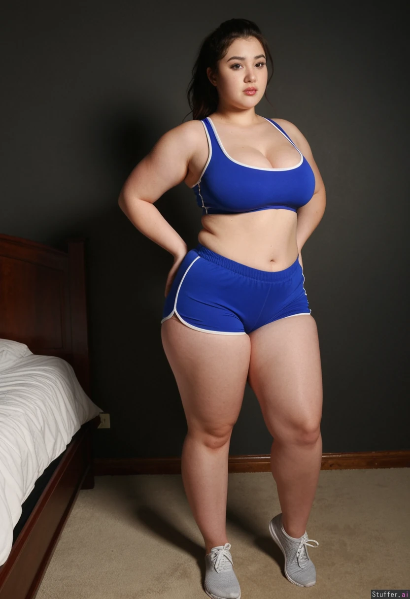 Setting: moody lighting bedroom Subject: half Chinese, 21 years old, ((curvy:1.4)), cleavage, wide hips, thick thighs, hip dips, round thighs, big hips, standing, athletic shorts, sports bra, slim face, full body, small shoulders, slim arms, skinny arms, slim waist, small waist
