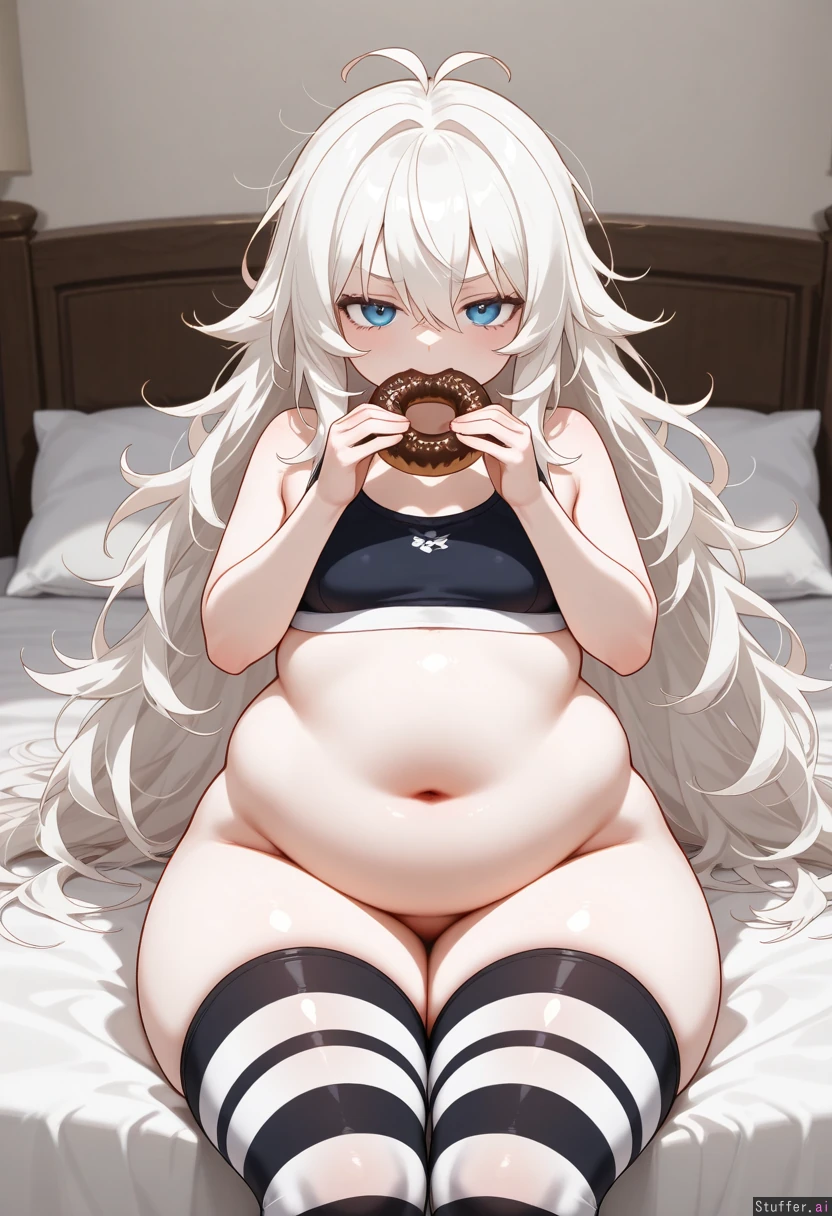 annoyed, messy hair, very long hair, white hair, pale skin, blue eyes, big fat belly, tiny black sports bra, extremely bottom heavy, tiny black and white striped stockings, cellulose on thighs, nude, front view, facing forwards, extremely wide hips, eating a chocolate donut, sitting on bed, large lower belly