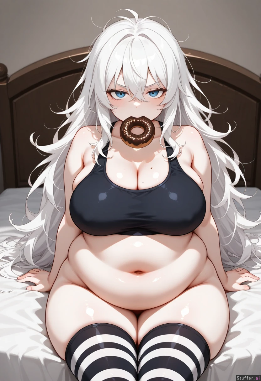 annoyed, messy hair, very long hair, white hair, pale skin, blue eyes, big fat belly, tiny black sports bra, extremely bottom heavy, tiny black and white striped stockings, cellulose on thighs, nude, front view, facing forwards, extremely wide hips, eating a chocolate donut, sitting on bed, large lower belly, massive belly