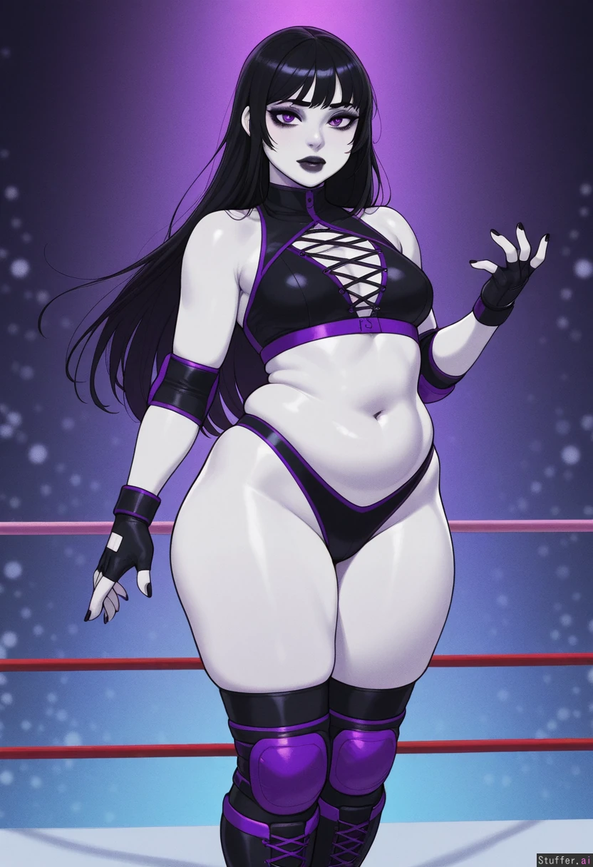 Krekkov (artist), KAMII MOMORU(artist), ohashi_art(artist), betterwithsalt(artist) (Flat colors), perfect proportions, perfect hands, vibrant colors, perfect eyes, detailed clean lineart, best quality, hdr, perfect anatomy, vibrant colors, perfect hands, five fingers on each hand, perfect eyes, film grain, VHS filter, simple eye design, skindentation, 1woman, pro wrestler, gothic woman, long hair, black hair, pale white skin, violet eyes, mascara, eyeliner, dark makeup, Black wrestling gear, exposed stomach, fingerless gloves, knee pads, elbow pads, white wrestling boots, plump belly, smallbreasts, Narrow shoulders, wide hips,