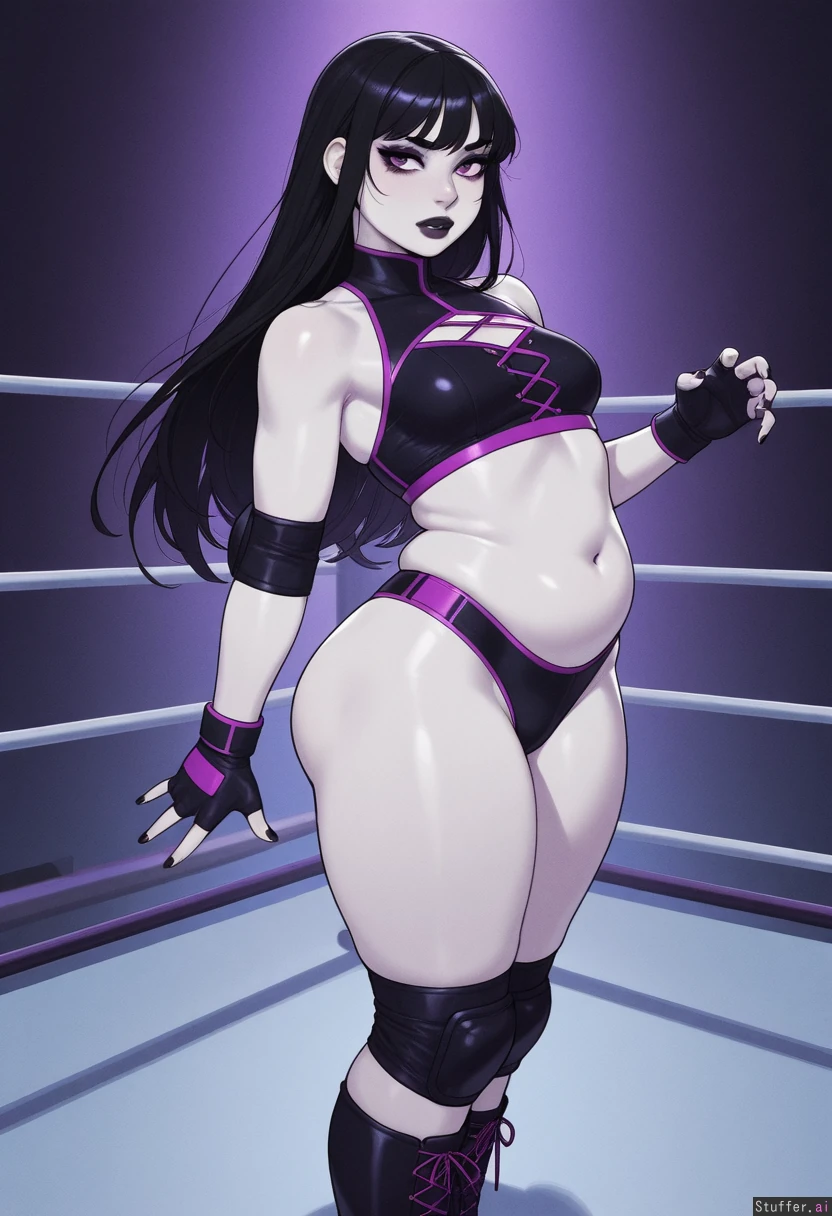 Krekkov (artist), KAMII MOMORU(artist), ohashi_art(artist), betterwithsalt(artist) (Flat colors), perfect proportions, perfect hands, vibrant colors, perfect eyes, detailed clean lineart, best quality, hdr, perfect anatomy, vibrant colors, perfect hands, five fingers on each hand, perfect eyes, film grain, VHS filter, simple eye design, skindentation, 1woman, pro wrestler, gothic woman, long hair, black hair, pale white skin, violet eyes, mascara, eyeliner, dark makeup, Black wrestling gear, exposed stomach, fingerless gloves, knee pads, elbow pads, white wrestling boots, plump belly, smallbreasts, Narrow shoulders, wide hips, (slim back), fat thighs,