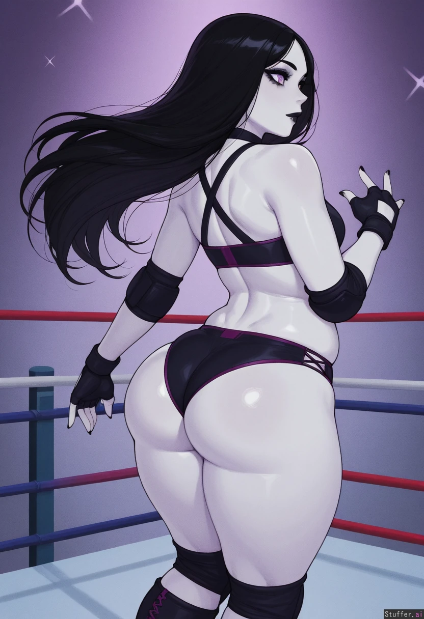 Krekkov (artist), KAMII MOMORU(artist), ohashi_art(artist), betterwithsalt(artist) (Flat colors), perfect proportions, perfect hands, vibrant colors, perfect eyes, detailed clean lineart, best quality, hdr, perfect anatomy, vibrant colors, perfect hands, five fingers on each hand, perfect eyes, film grain, VHS filter, simple eye design, skindentation, 1woman, pro wrestler, gothic woman, long hair, black hair, pale white skin, violet eyes, mascara, eyeliner, dark makeup, Black wrestling gear, exposed stomach, fingerless gloves, knee pads, elbow pads, white wrestling boots, plump belly, smallbreasts, Narrow shoulders, wide hips, (slim back:1.2), (fat thighs), fat ass,