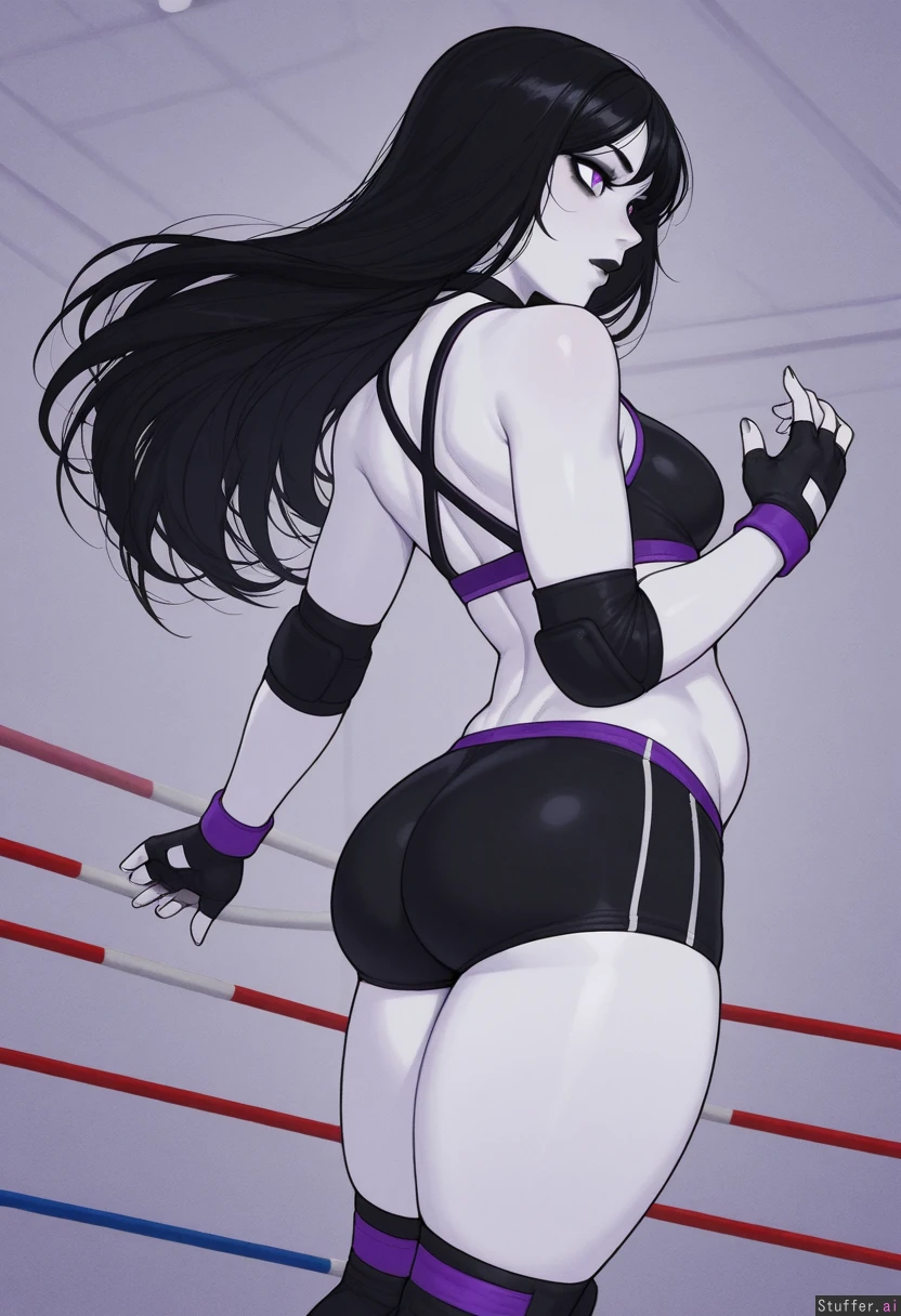 Krekkov (artist), KAMII MOMORU(artist), ohashi_art(artist), betterwithsalt(artist) (Flat colors), perfect proportions, perfect hands, vibrant colors, perfect eyes, detailed clean lineart, best quality, hdr, perfect anatomy, vibrant colors, perfect hands, five fingers on each hand, perfect eyes, film grain, VHS filter, simple eye design, skindentation, 1woman, pro wrestler, gothic woman, long hair, black hair, pale white skin, violet eyes, mascara, eyeliner, dark makeup, Black wrestling gear, exposed stomach, fingerless gloves, knee pads, elbow pads, white wrestling boots, plump belly, smallbreasts, Narrow shoulders, wide hips, (slim back:1.2), (fat thighs), side angle,