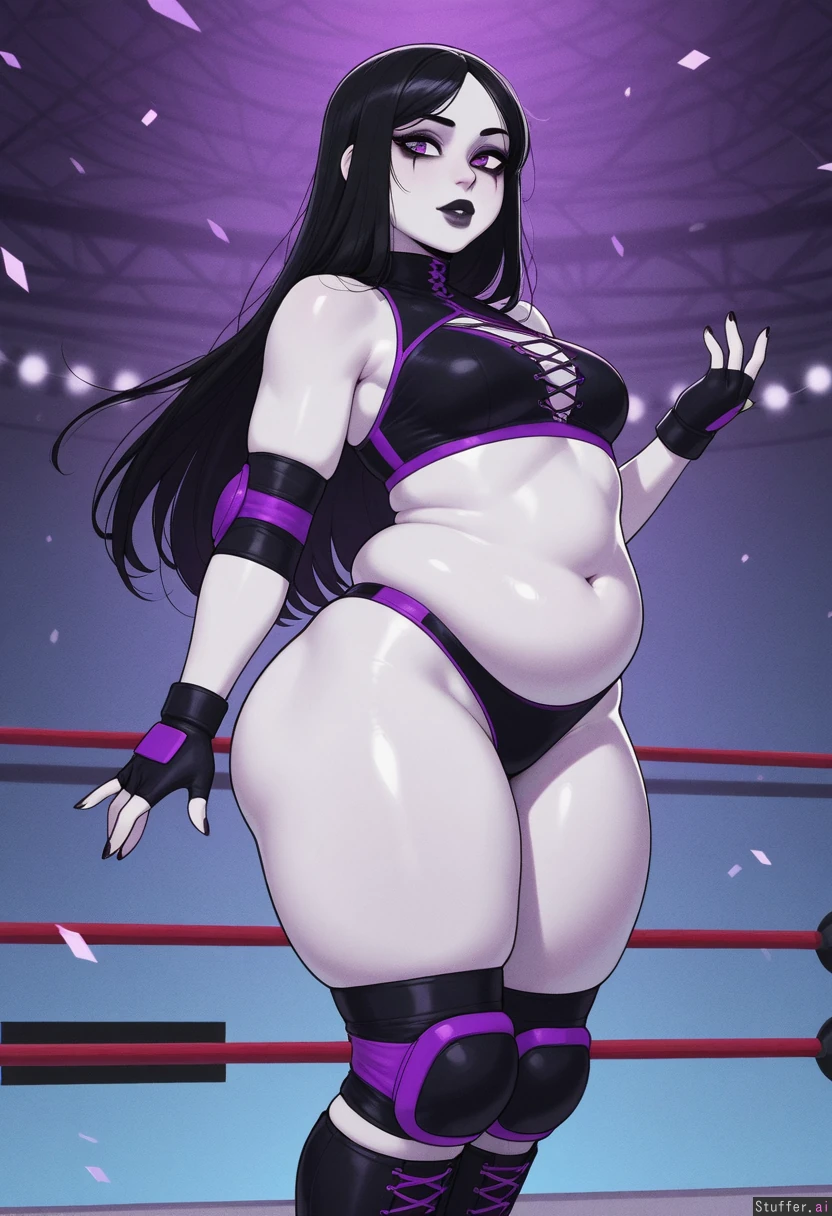 Krekkov (artist), KAMII MOMORU(artist), ohashi_art(artist), betterwithsalt(artist) (Flat colors), perfect proportions, perfect hands, vibrant colors, perfect eyes, detailed clean lineart, best quality, hdr, perfect anatomy, vibrant colors, perfect hands, five fingers on each hand, perfect eyes, film grain, VHS filter, simple eye design, skindentation, 1woman, pro wrestler, gothic woman, long hair, black hair, pale white skin, violet eyes, mascara, eyeliner, dark makeup, Black wrestling gear, exposed stomach, fingerless gloves, knee pads, elbow pads, white wrestling boots, plump belly, smallbreasts, Narrow shoulders, wide hips, slim back, (fat thighs:1.2), cute face,
