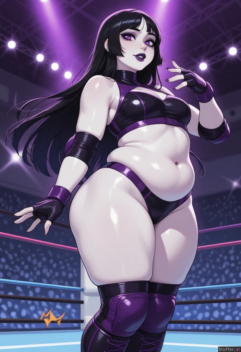 Krekkov (artist), KAMII MOMORU(artist), ohashi_art(artist), betterwithsalt(artist) (Flat colors), perfect proportions, perfect hands, vibrant colors, perfect eyes, detailed clean lineart, best quality, hdr, perfect anatomy, vibrant colors, perfect hands, five fingers on each hand, perfect eyes, film grain, VHS filter, simple eye design, skindentation, 1woman, pro wrestler, gothic woman, long hair, black hair, pale white skin, violet eyes, mascara, eyeliner, dark makeup, Black wrestling gear, exposed stomach, fingerless gloves, knee pads, elbow pads, white wrestling boots, plump belly, smallbreasts, Narrow shoulders, wide hips, slim back, (fat thighs:1.2), cute face, slim waist,