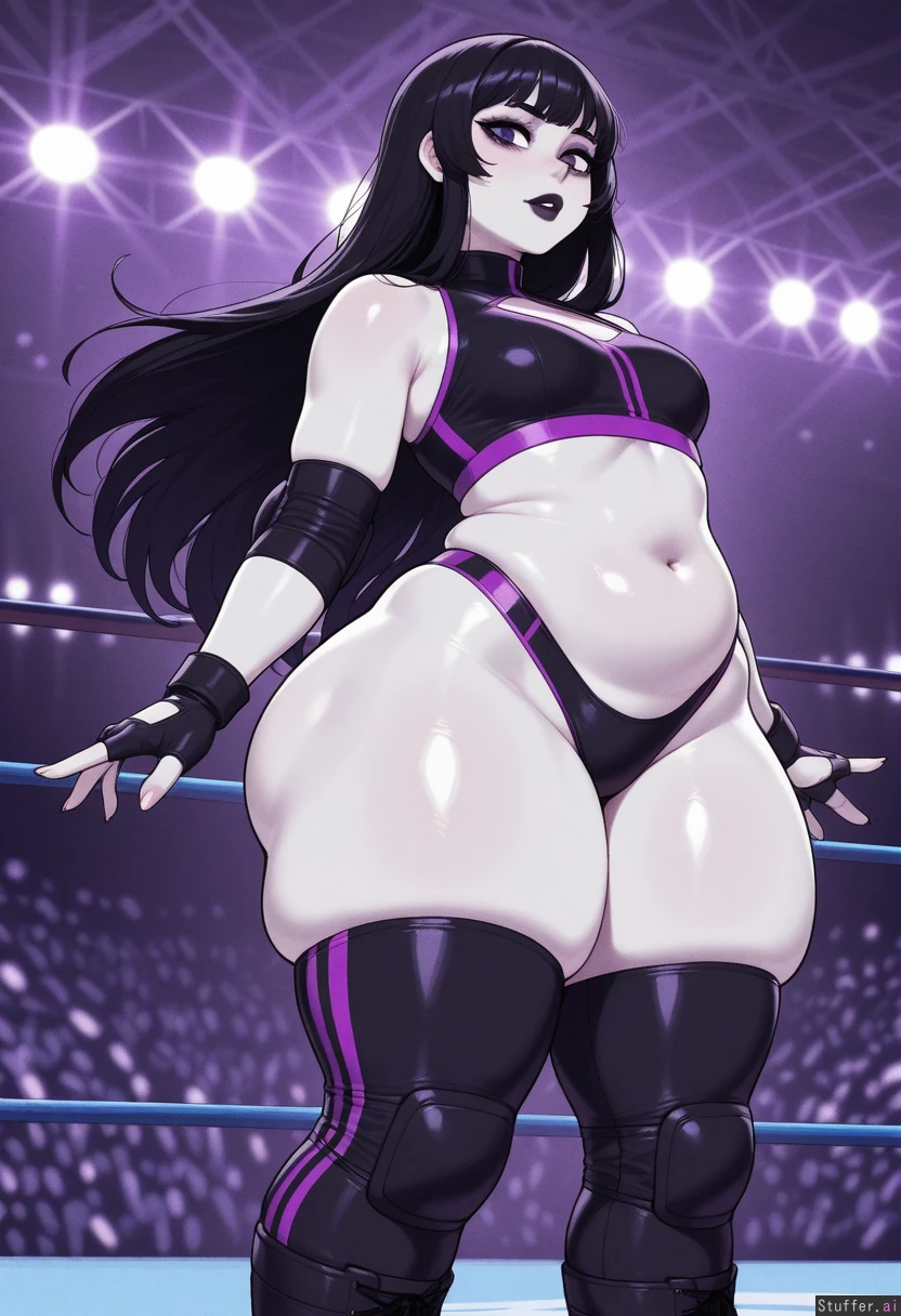 Krekkov (artist), KAMII MOMORU(artist), ohashi_art(artist), betterwithsalt(artist) (Flat colors), perfect proportions, perfect hands, vibrant colors, perfect eyes, detailed clean lineart, best quality, hdr, perfect anatomy, vibrant colors, perfect hands, five fingers on each hand, perfect eyes, film grain, VHS filter, simple eye design, skindentation, 1woman, pro wrestler, gothic woman, long hair, black hair, pale white skin, violet eyes, mascara, eyeliner, dark makeup, Black wrestling gear, exposed stomach, fingerless gloves, knee pads, elbow pads, white wrestling boots, plump belly, smallbreasts, Narrow shoulders, wide hips, (slim back), (fat thighs:1.2), cute face, slim waist, (thigh overflow:1.2), (huge thighs:1.4),