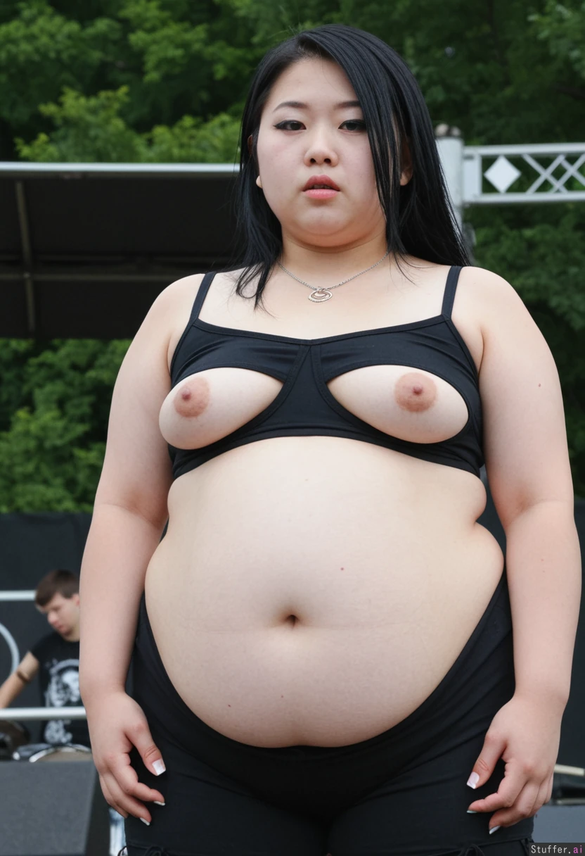 Setting: outdoor concert Subject: Asian, goth, 20 years old, bloated belly