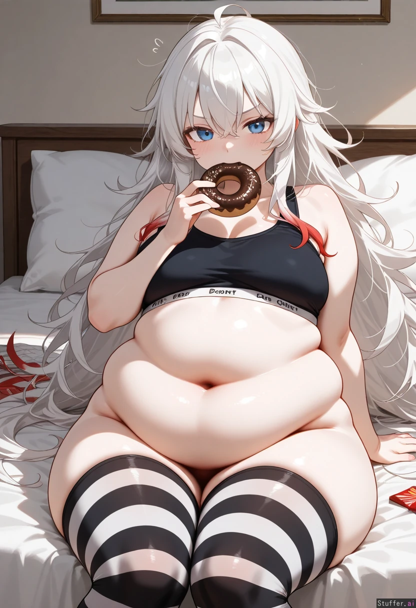 annoyed, messy hair, very long hair, white hair with red tips, pale skin, blue eyes, big fat belly, tiny black sports bra, extremely bottom heavy, tiny black and white striped stockings, cellulose on thighs, nude, front view, facing forwards, extremely wide hips, eating a chocolate donut, sitting on bed, large lower belly, massive belly, blushing, obese