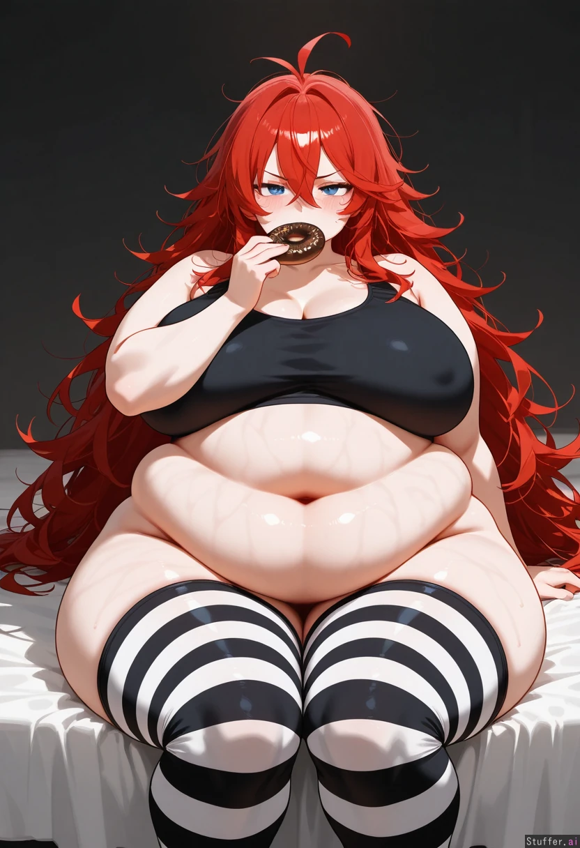 annoyed, messy hair, very long hair, red hair, pale skin, blue eyes, big fat belly, tiny black sports bra, extremely bottom heavy, tiny black and white striped stockings, cellulose on thighs, nude, front view, facing forwards, extremely wide hips, eating a chocolate donut, sitting on bed, large lower belly, massive belly, blushing, morbidly obese blob, stretch marks at sides