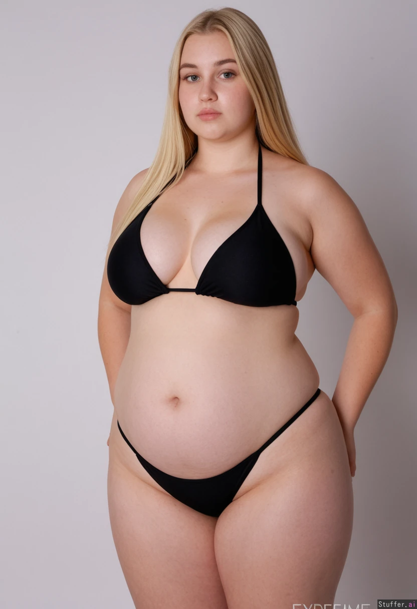 Setting: moody lighting bedroom Subject: blonde makeup, 21 years old, ((curvy:1)), cleavage, wide hips, ((thick thighs, hip dips, round thighs, soft low huge belly, big hips:1.7), (black bikini:1.9), standing, (slim perfect detailed beautiful face, slight sight full body view, small shoulders, slim arms, skinny arms, slim waist, small waist:1.3), ((extremely bloated:1.9))