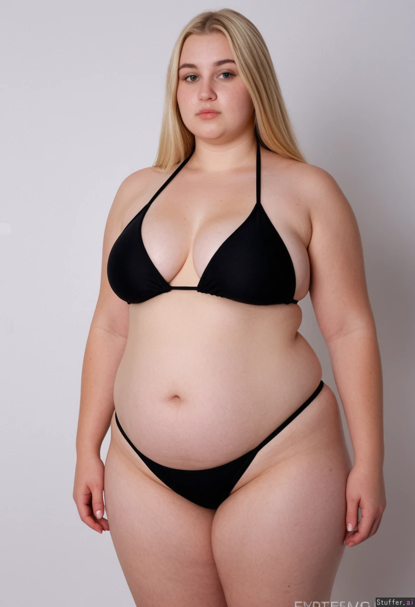 Setting: moody lighting bedroom Subject: blonde makeup, 21 years old, ((curvy:1)), cleavage, wide hips, ((thick thighs, hip dips, round thighs, chubby low belly, big hips:1.7), (black bikini:1.9), standing, (slim perfect detailed beautiful face, slight sight full body view, small shoulders, slim arms, skinny arms, slim waist, small waist:1.3), ((extremely bloated:1.9))