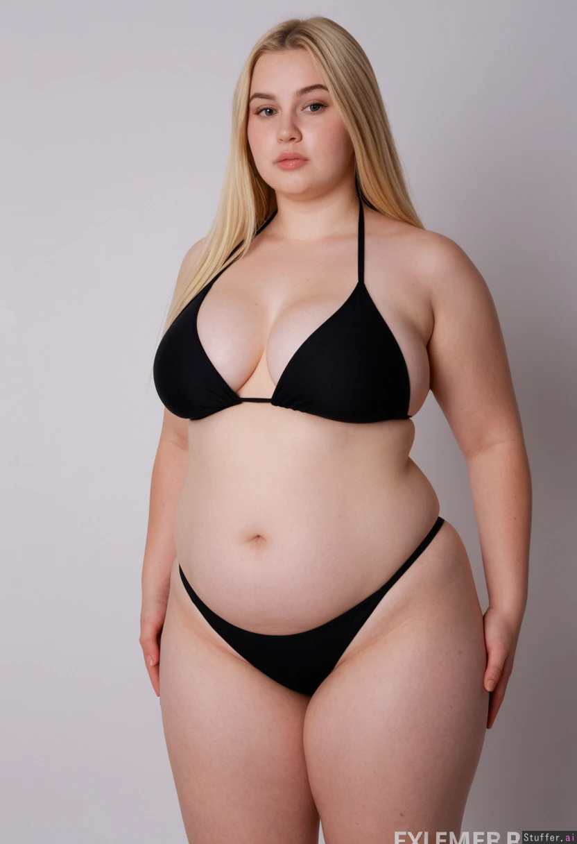 Setting: moody lighting bedroom Subject: blonde makeup, 21 years old, ((curvy:1)), cleavage, wide hips, ((thick thighs, hip dips, round thighs, soft low belly, big hips:1.9), (black bikini:1.9), standing, (slim perfect detailed beautiful face, slight sight full body view, small shoulders, slim arms, skinny arms, slim waist, small waist:1.3), ((extremely bloated:1.9))