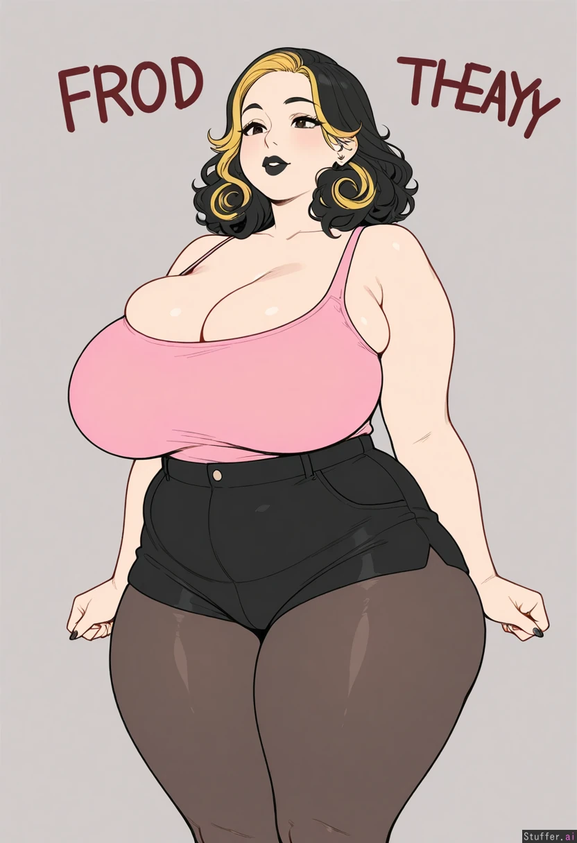 (high_rating, high_detail, flat_color, simple background), solo, female, (milf, bimbo, out of shape, voluptuous, plump), ((frontheavy:1.4)), ((bimbofication:1.2)), ((slimthick:1.2)), ((massive_breasts:1.2)), (curly black hair, blonde highlights), black lipstick, (chubby_face, double_chin), (pink tank_top, black high-waist_jean_shorts, pantyhose, tight clothes, skindentation), (soft_arms, soft_thighs),