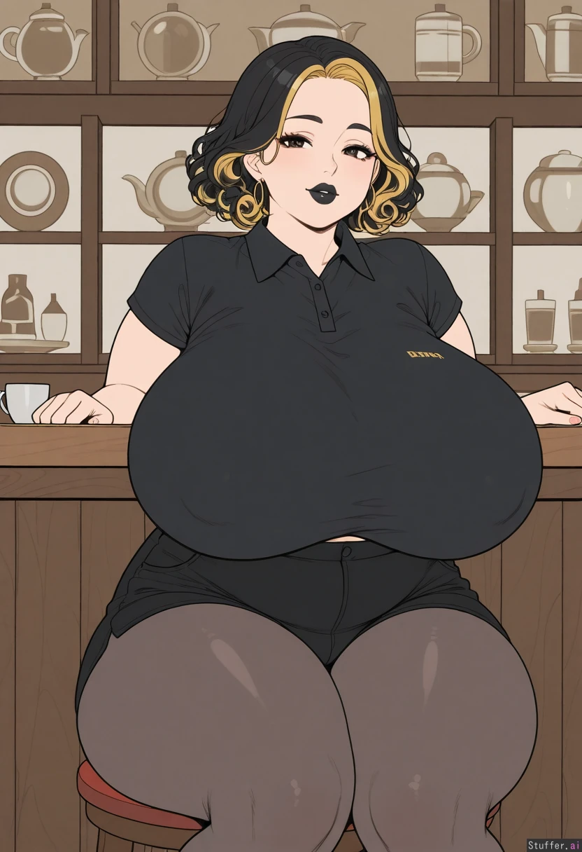 (high_rating, high_detail, flat_color, simple background), (cafe, indoors, sitting), solo, female, (milf, bimbo, out of shape, voluptuous, plump), ((frontheavy:1.4)), ((bimbofication:1.2)), ((slimthick:1.2)), ((massive_breasts:1.2)), (curly black hair, blonde highlights), black lipstick, (chubby_face, double_chin), (black polo_shirt, black high-waist_jean_shorts, pantyhose, tight clothes, skindentation), (soft_arms, soft_thighs),